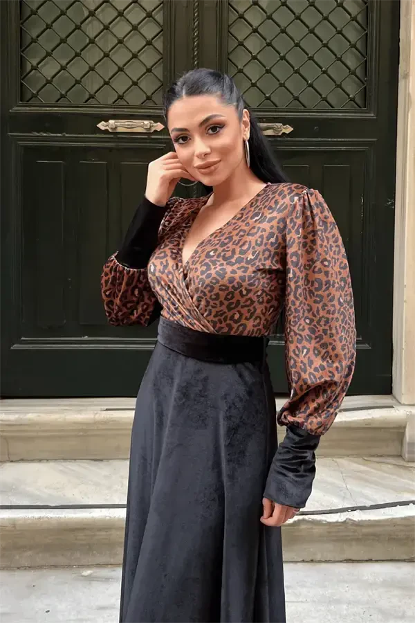 Kadife Kumaş Leopar Detaylı Elbise, sadece bir kıyafet değil, aynı zamanda bir ifade biçimidir. Bu elbise ile stilinizi yansıtın, özgüveninizi artırın ve her ortamda fark yaratın. Gardırobunuzun yıldızı olacak bu özel tasarımı kaçırmayın! Leopar deseni, cesur ve özgün stilinizi yansıtırken, kadife kumaşın lüks dokusu, zarafetinizi ön plana çıkarır. Siyahın zamansız şıklığı ile birleşen bu detaylar, elbiseyi her mevsim ve her ortamda giyilebilir kılar.