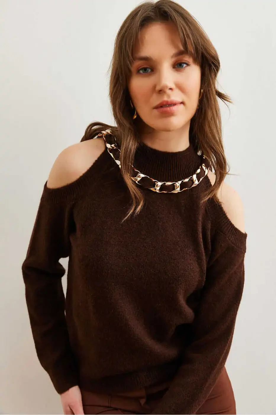 Kadın Acı Kahve Triko Kazak | Yumuşak Dokulu | Kalın Zincir Detaylı
