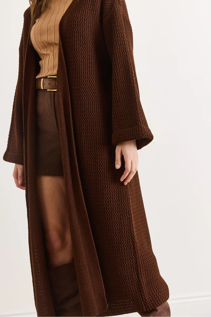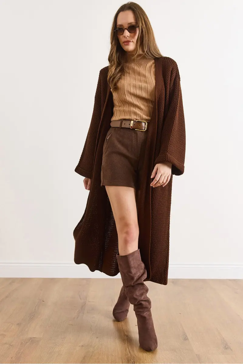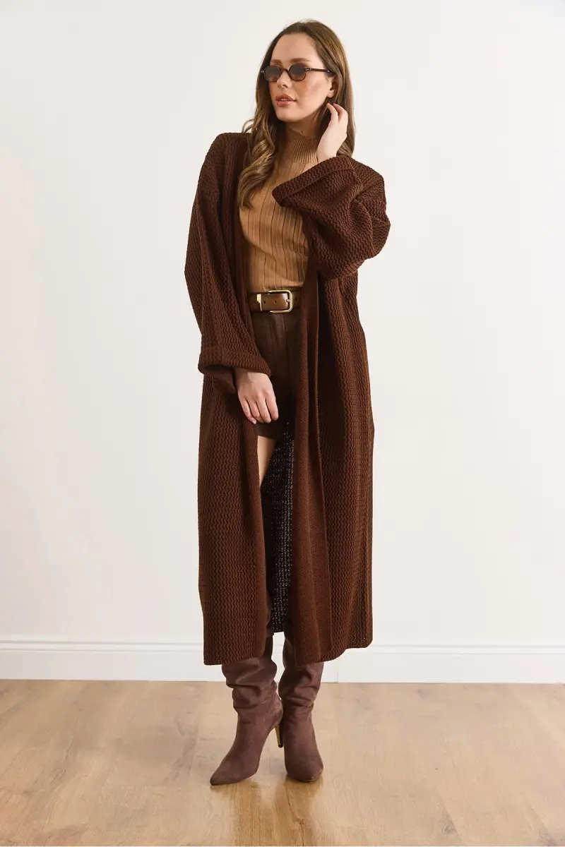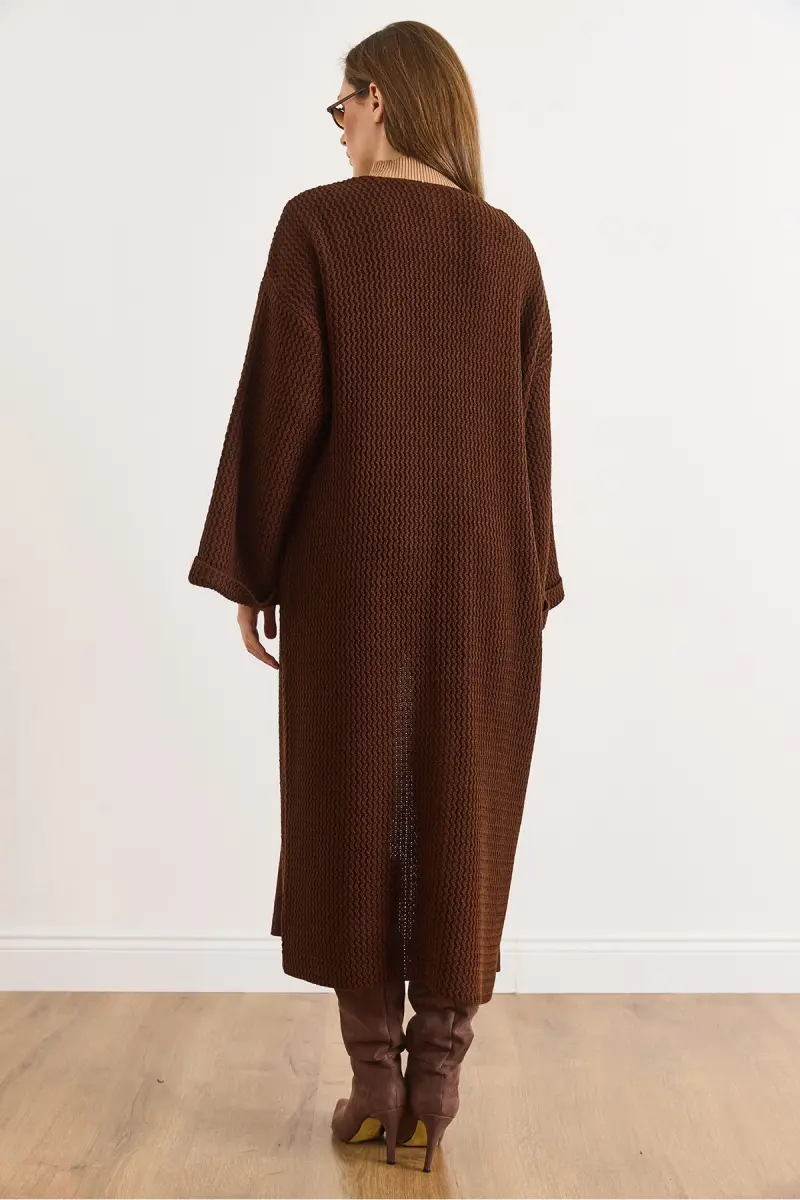 Kadın Acı Kahve Manşeti Katlamalı Maxi Triko Hırka HRK-19000297-Acı Kahve