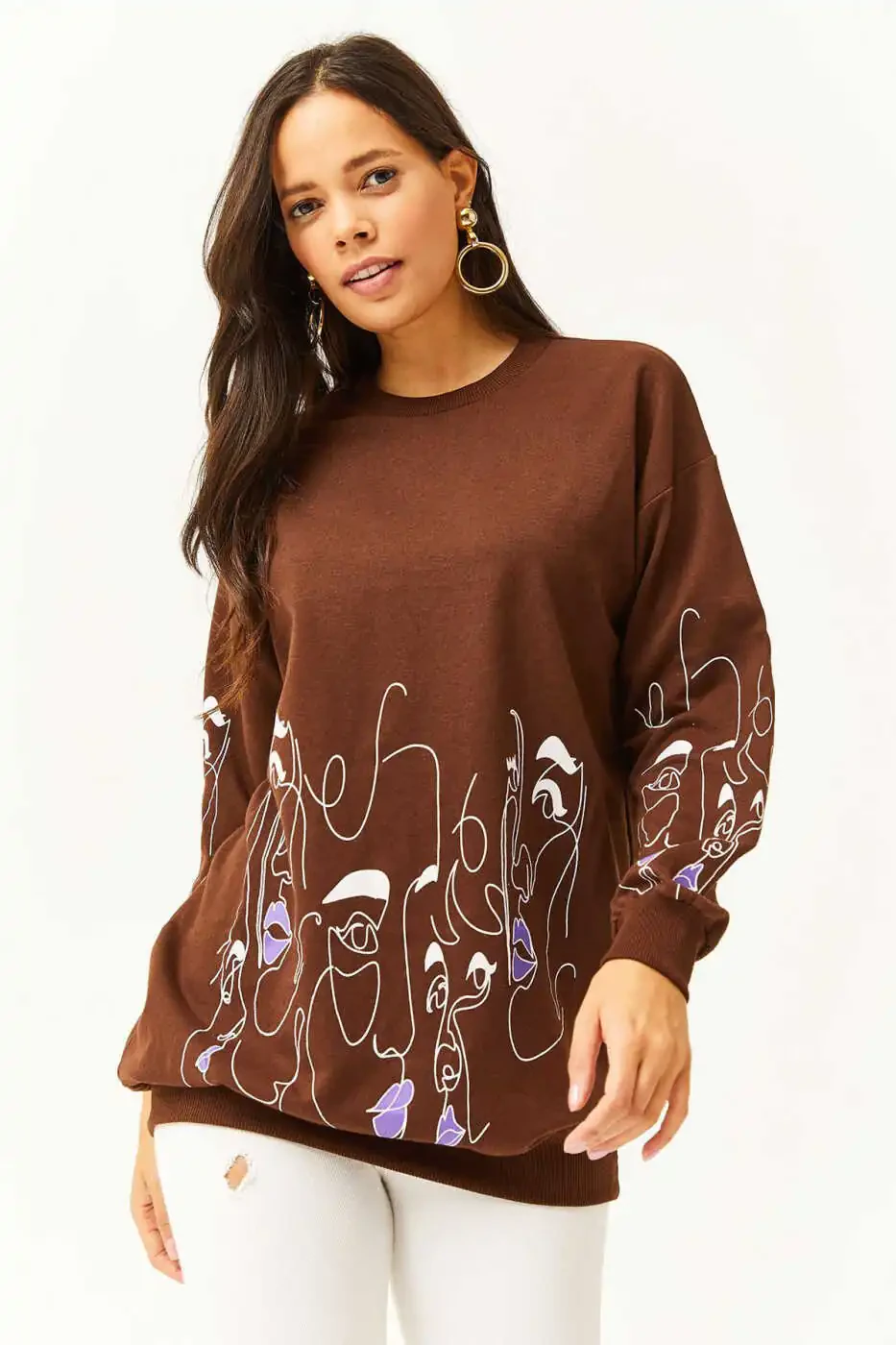 Women's Bitter Coffee Face Figured Oversize Sweatshirt