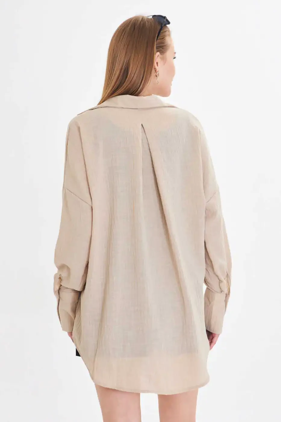 This light beige oversized shirt, perfect for women seeking comfort and style in everyday life, stands out with its texture and wide sleeves. Its linen-look fabric offers both stylish and comfortable wear. This shirt, with its oversized cut that hugs your body, will easily adapt to all your outfits.