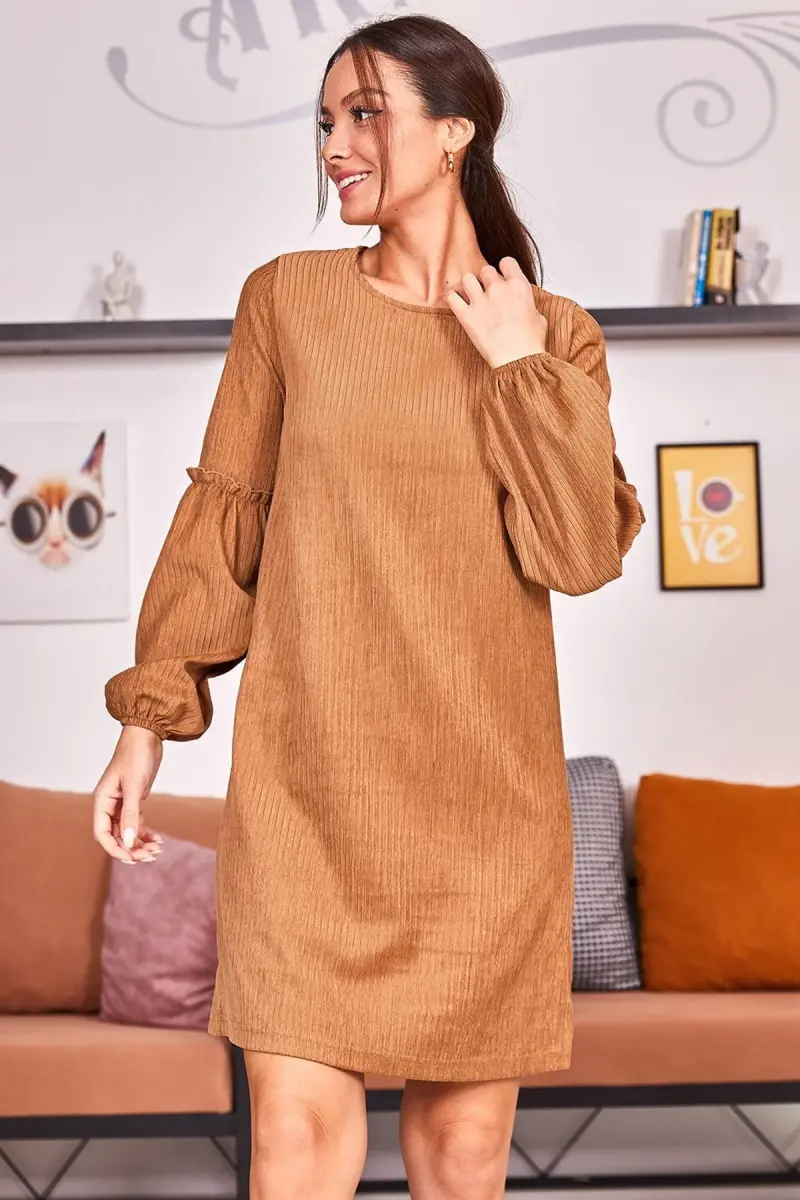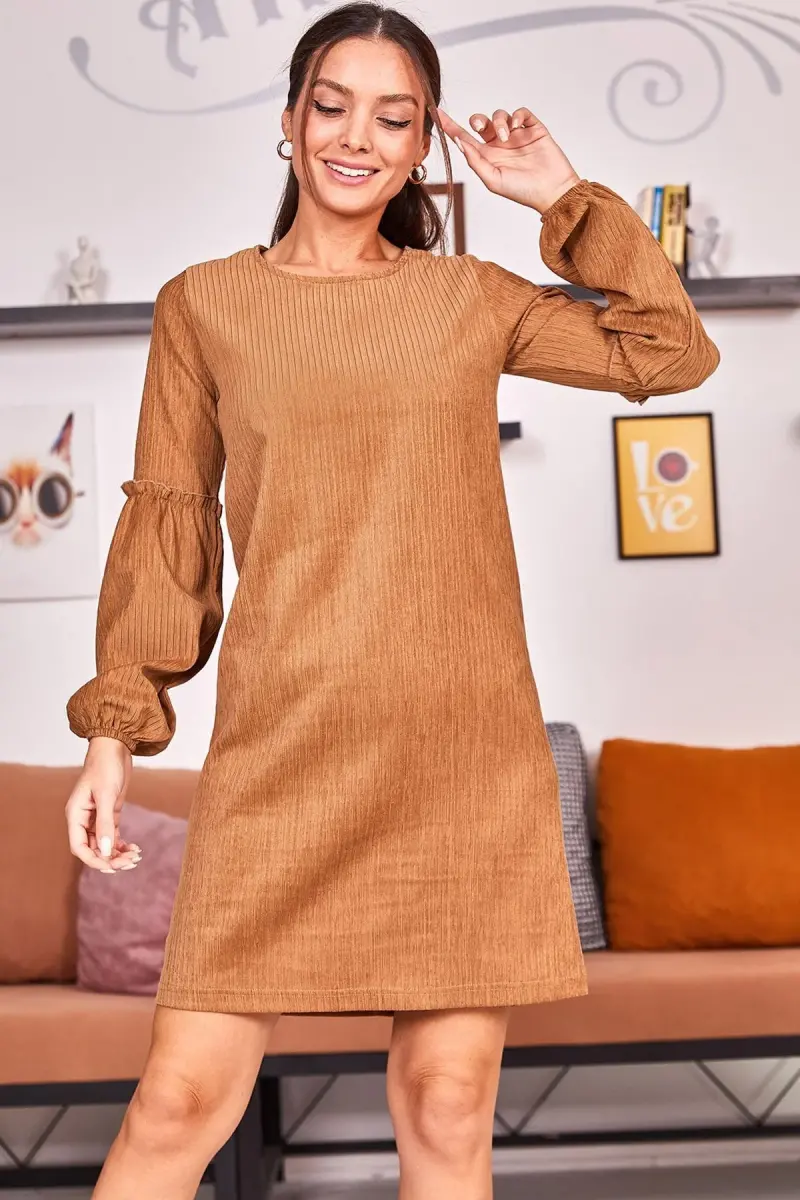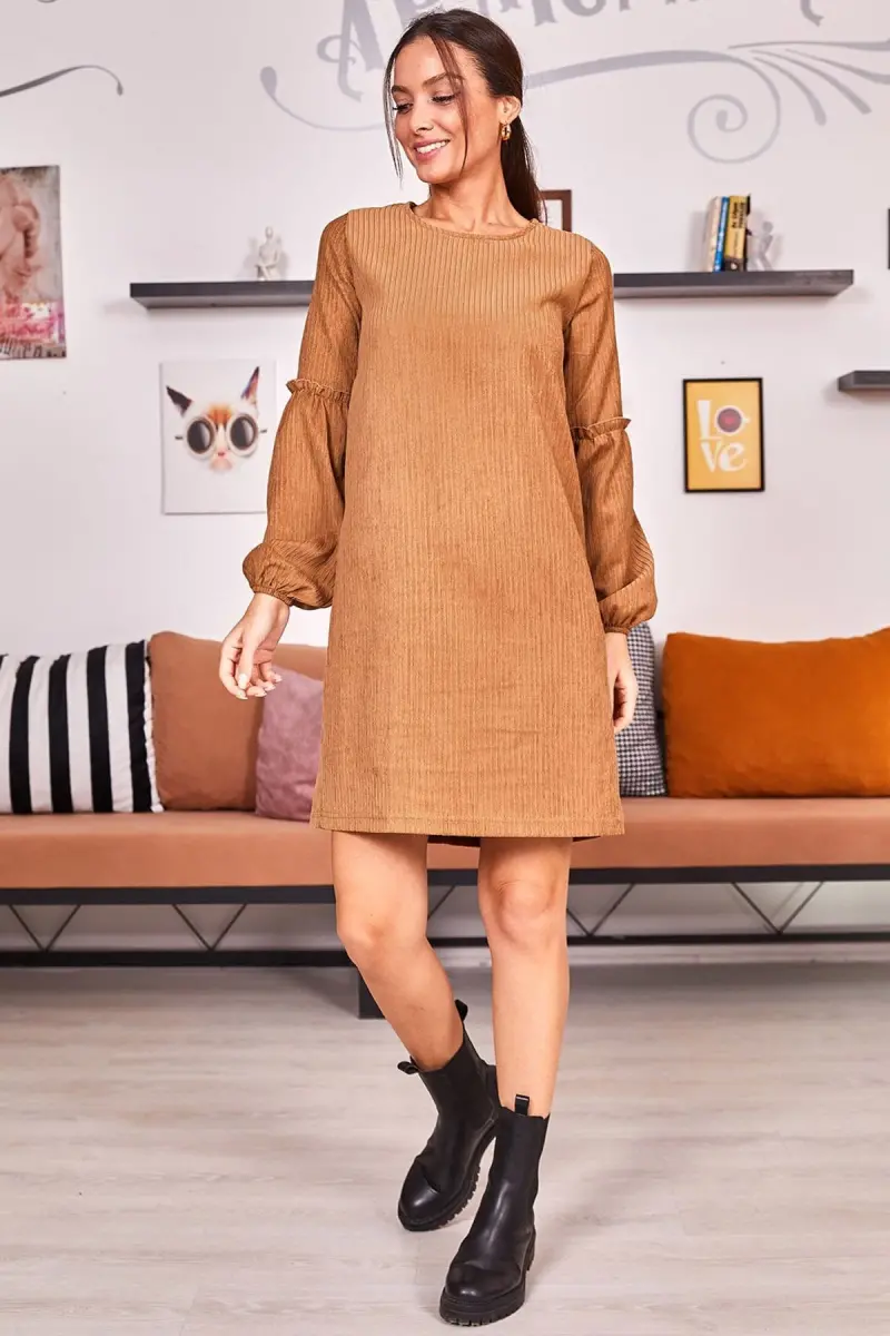 Kadın Açık Kahve Kolu Balonlu Kadife Elbise ARM-20K001107-Açık Kahve