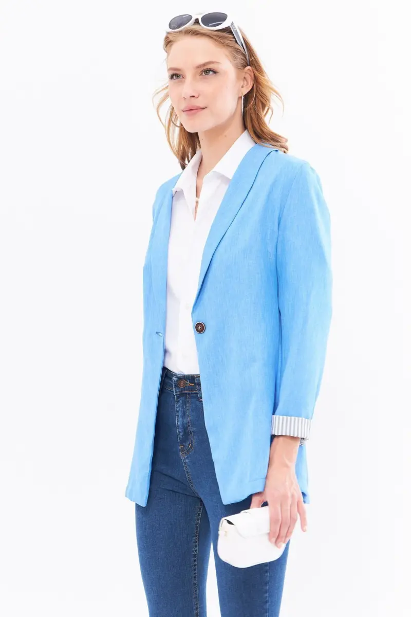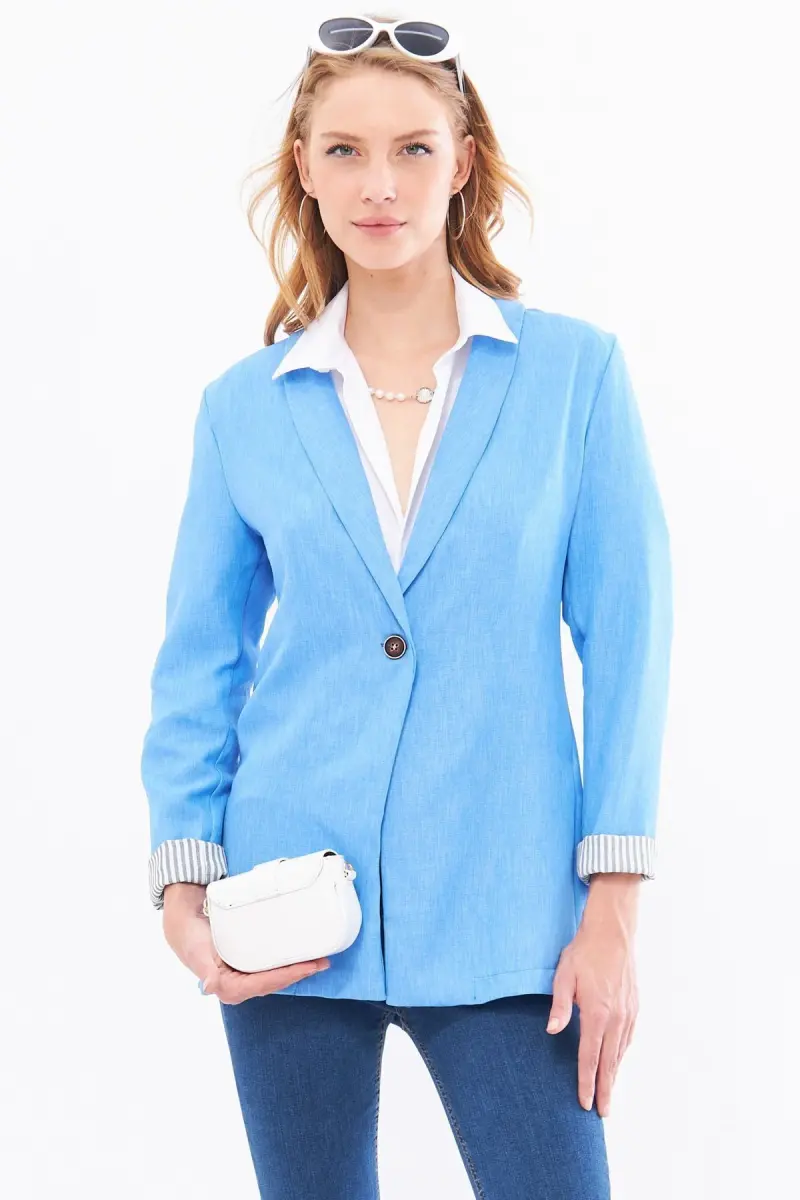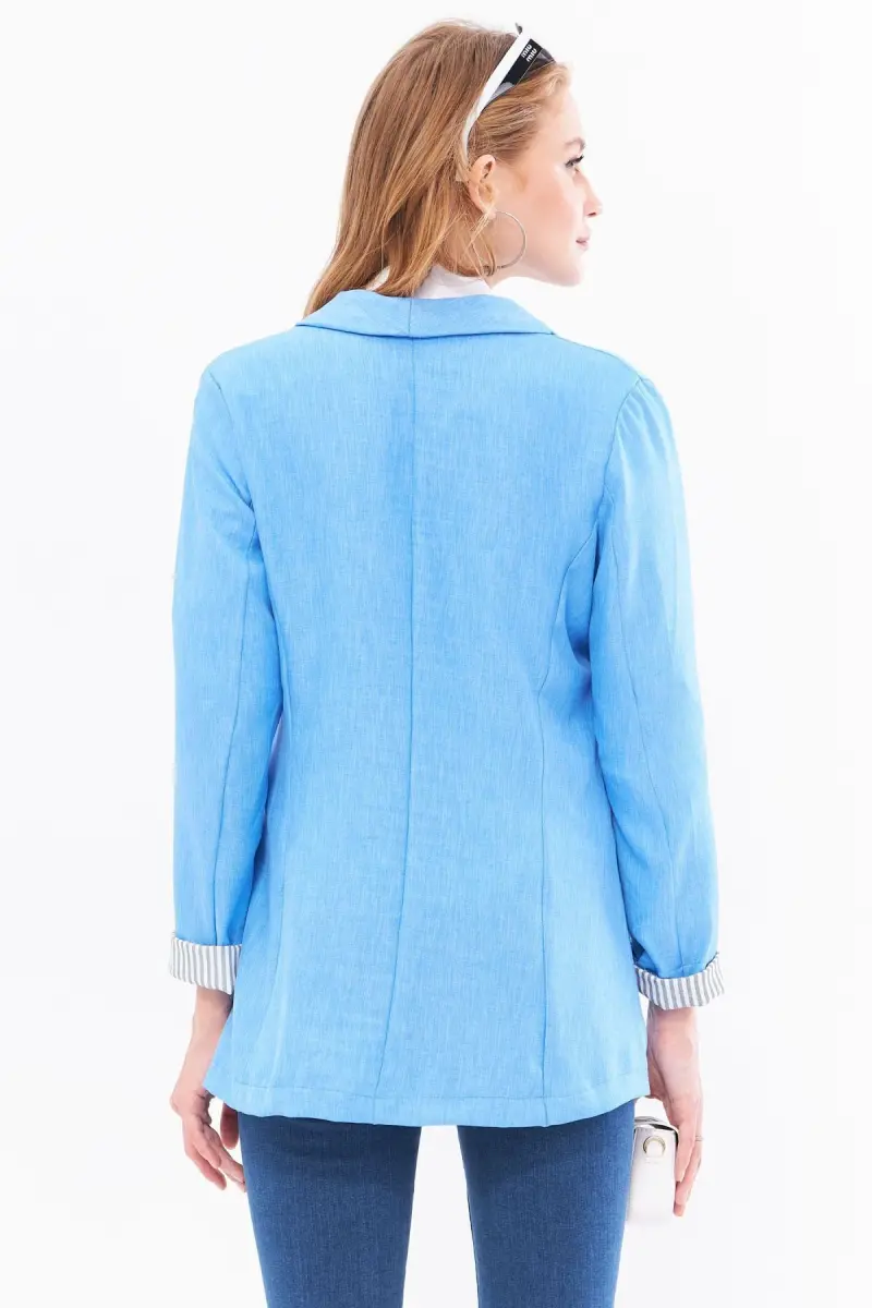 Kadın Açık Mavi Kol İçi Çizgili Tek Düğmeli Ceket ARM-22K001122-Açık Mavi