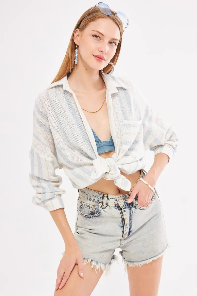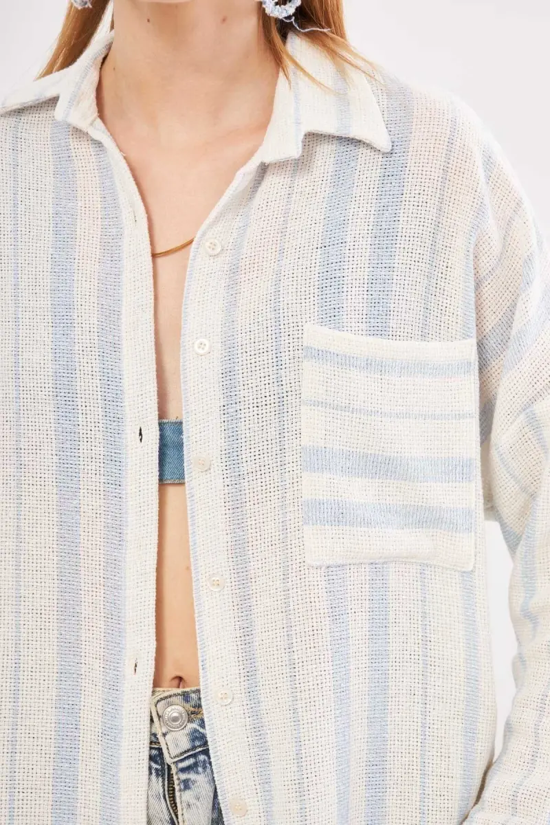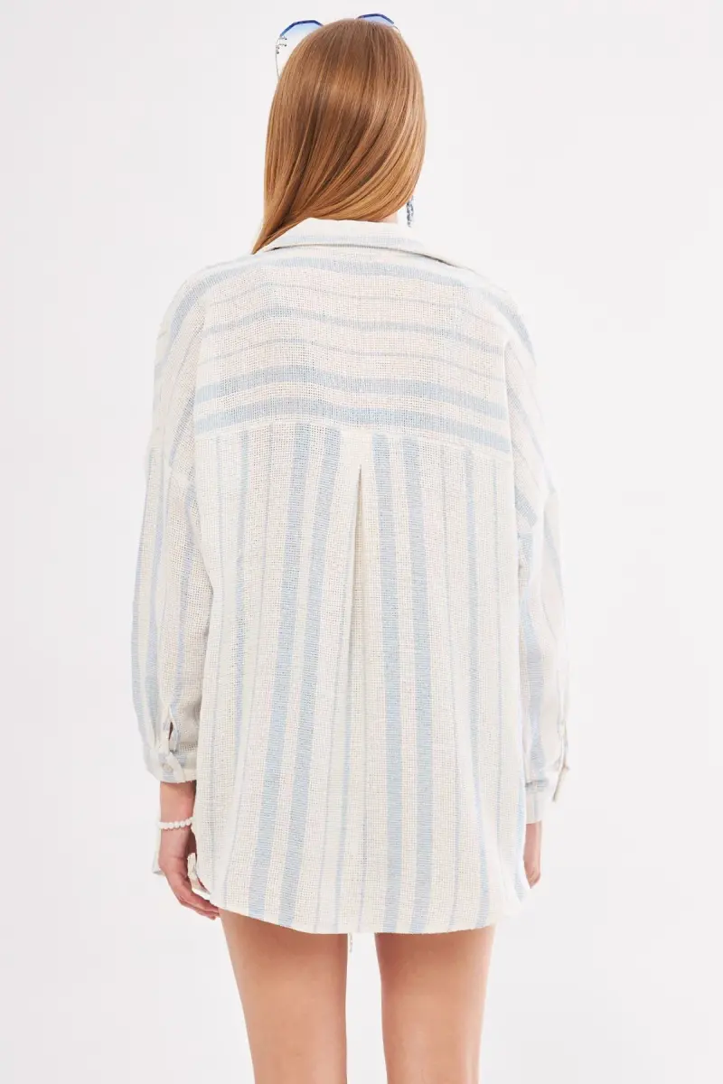 Kadın Açık Mavi Uzun Kollu Cep Detaylı Sırtı Pileli Çizgili Oversize Gömlek ARM-24Y001053-Açık Mavi