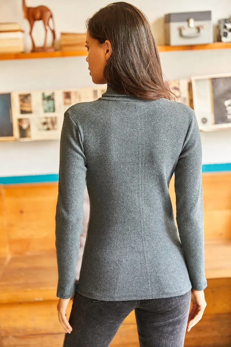 Kadın Antrasit Balıkçı Yaka Şardonlu Kaşkorse Kazak KZK-19000395-Antrasit