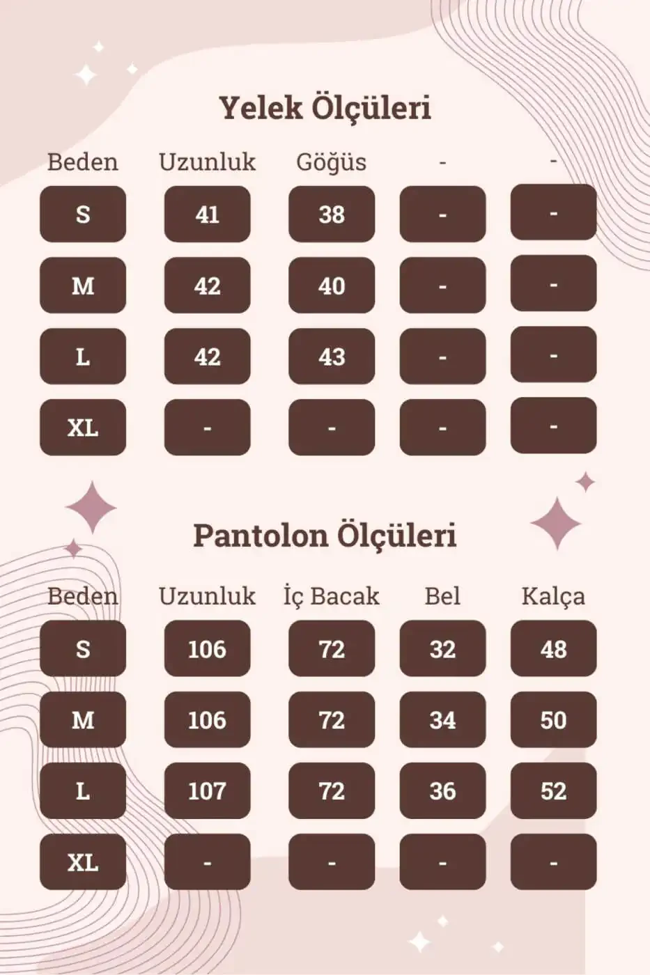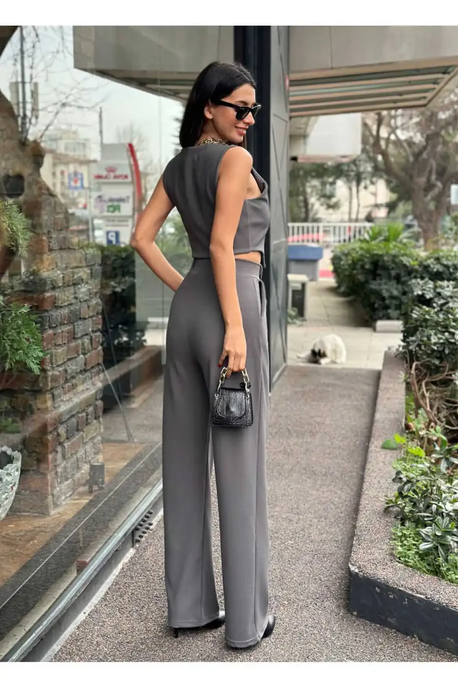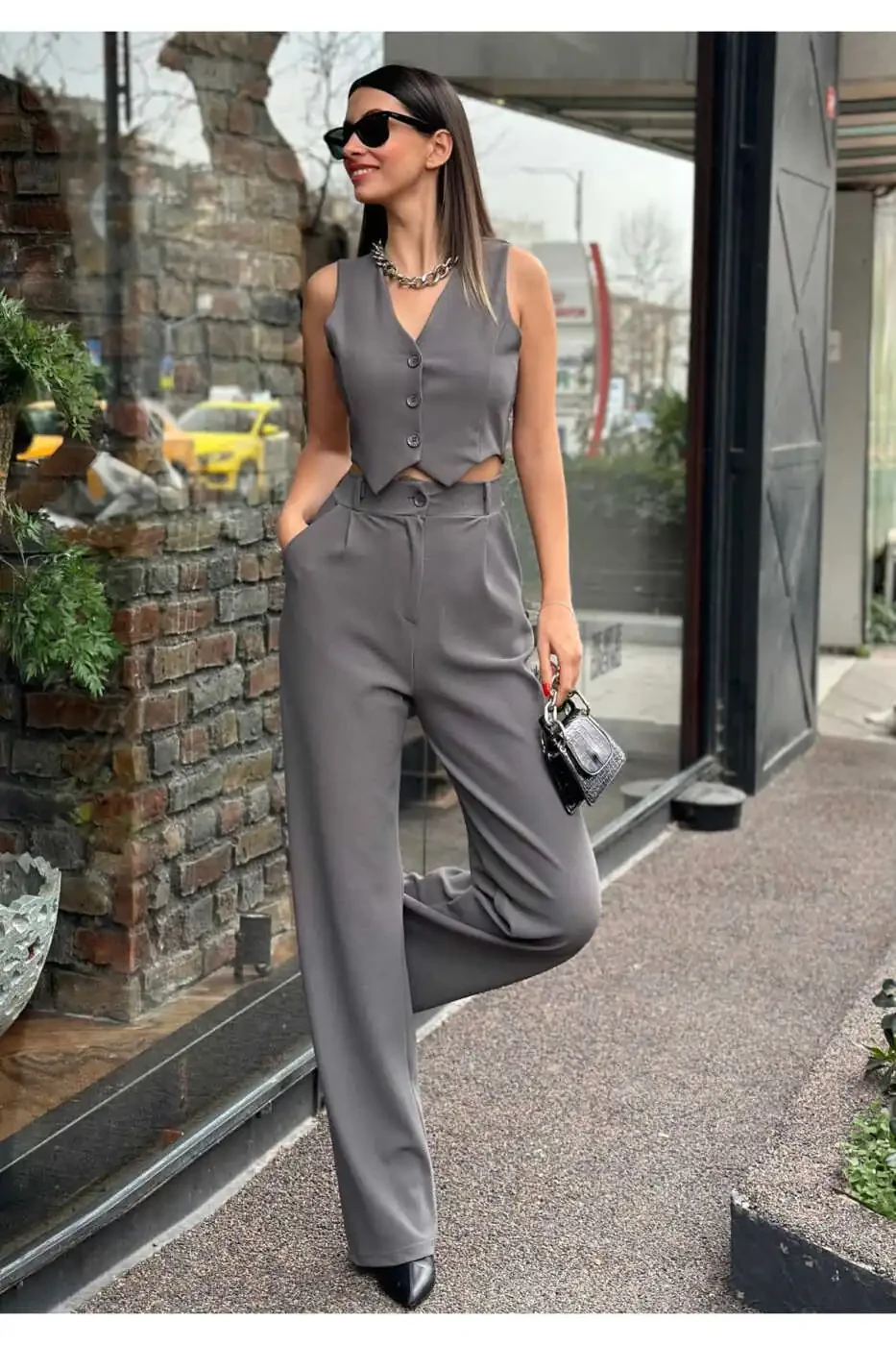 Yelek, zarif bir kesimle tasarlanmıştır ve göğüs kısmında düğme kapatma özelliği bulunur. Yüksek bel pantolon, bacakları daha uzun gösteren ve belinizi belirginleştiren şık bir kesime sahiptir. Antrasit rengi, hem günlük hayatta hem de özel günlerde rahatlıkla kombinlenebilir.