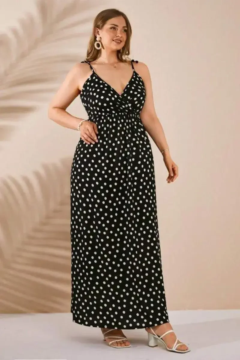kadin yazlik elbise, puantiyeli elbise, siyah elbise, askili elbise, beli lastikli elbise, büyük beden elbise