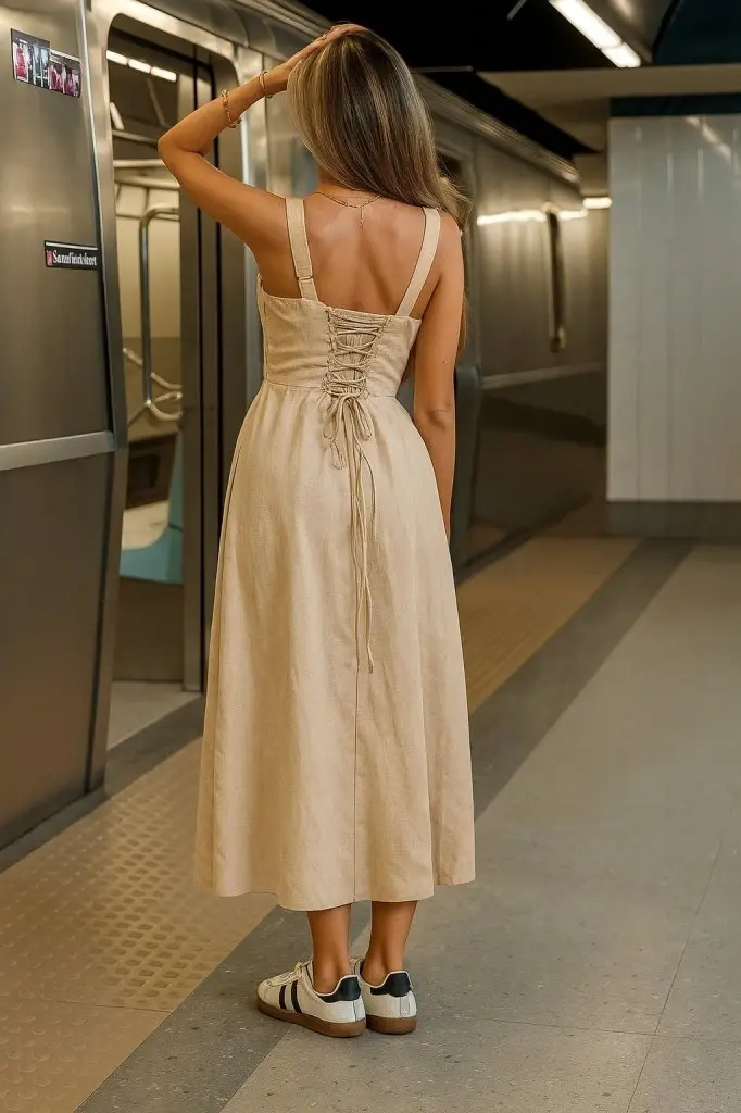 Kadın Askılı Geniş V Yakalı Sırttan Bağlamalı Yırtmaçlı Süprem Elbise