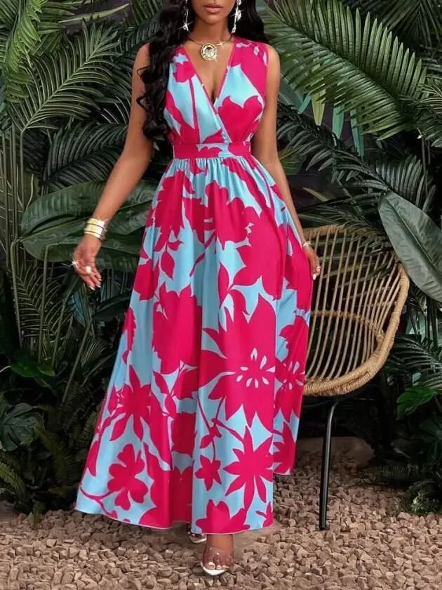 Kadın Askılı Kruvaze Yakalı çiçek Desenli Uzun Süprem Elbise