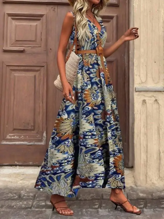 Kadın Askılı Kruvaze Yakalı Uzun Desenli Kemersiz Süprem Elbise
