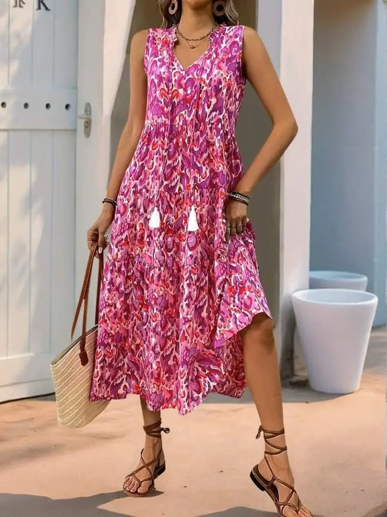Kadın Askılı Yakası Fırfırlı Bağcıklı Desenli Uzun Süprem Elbise