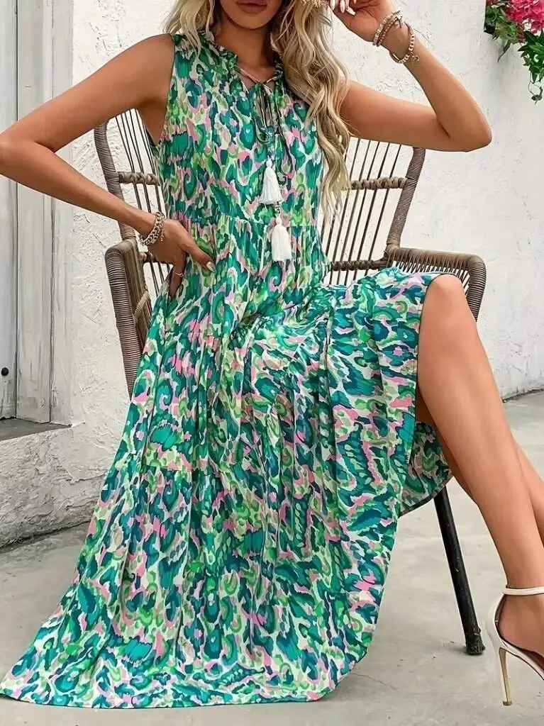 Kadın Askılı Yakası Fırfırlı Bağcıklı Desenli Uzun Süprem Elbise