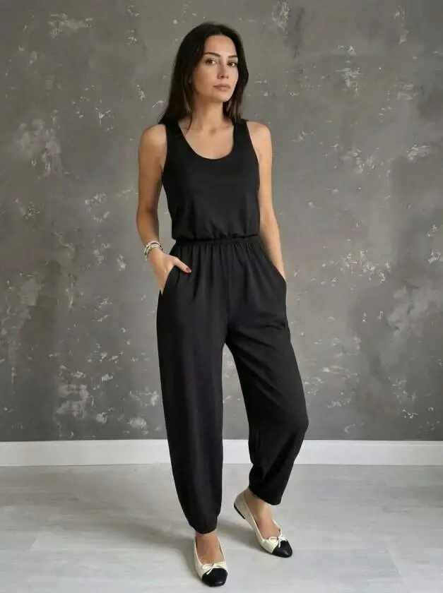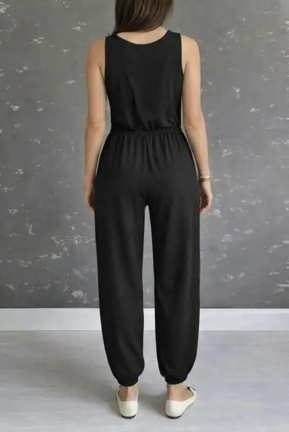 Kadın Askılı Yuvarlak Yakalı Cepli Viskon Tulum