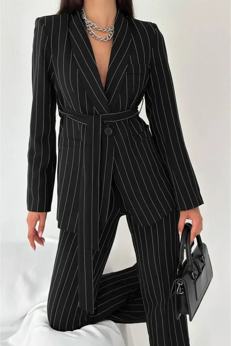 Kadın Bağlamalı Sahte Cepli Kemerli Şal Yaka Blazer Ceket Boru Paça Esnek Pantolon Takım Elbise, modern ve şık bir görünüm arayan kadınlar için ideal bir seçenektir. Siyah çizgili deseni ile klasik ve çağdaş çizgileri bir araya getiren bu takım elbise, hem iş hayatında hem de özel davetlerde rahatlıkla kullanılabilir. Blazer ceketin bağlamalı detayı ve şal yakası, feminen bir silüet oluştururken, sahte cepler ise şıklığına ayrı bir hava katmaktadır. Kemer detayı, belinizi vurgulayarak daha fit bir görünüm elde etmenizi sağlarken, boru paça esnek pantolon gün boyu hareket özgürlüğü sunar. Yüksek kaliteli kumaşı sayesinde uzun ömürlü kullanım imkanı sunan bu takım elbise, gardırobunuzun vazgeçilmez parçalarından biri olacaktır. Ofiste, toplantılarda, akşam yemeklerinde veya özel günlerde stilinizi konuşturmak için bu takım elbiseyi tercih edebilirsiniz. Takımın siyah çizgili tasarımı, farklı aksesuarlarla kolayca kombinlenebilir ve her ortama uyum sağlayabilir. Bu takım elbise ile hem şık hem de rahat olmanın keyfini çıkarın. Kendinizi özel ve özgüvenli hissetmek için bu mükemmel seçimi yapın. Gardırobunuzda mutlaka bulunması gereken bu parça, stilinizi bir üst seviyeye taşıyacak. Hem modern hem de klasik detayları bir arada sunan bu takım elbise, her kadının beğenisini kazanacak. Şıklığı ve rahatlığı bir arada arayanlar için tasarlanmış olan bu takım elbise, her zaman bakımlı ve stil sahibi görünmenizi sağlayacak.