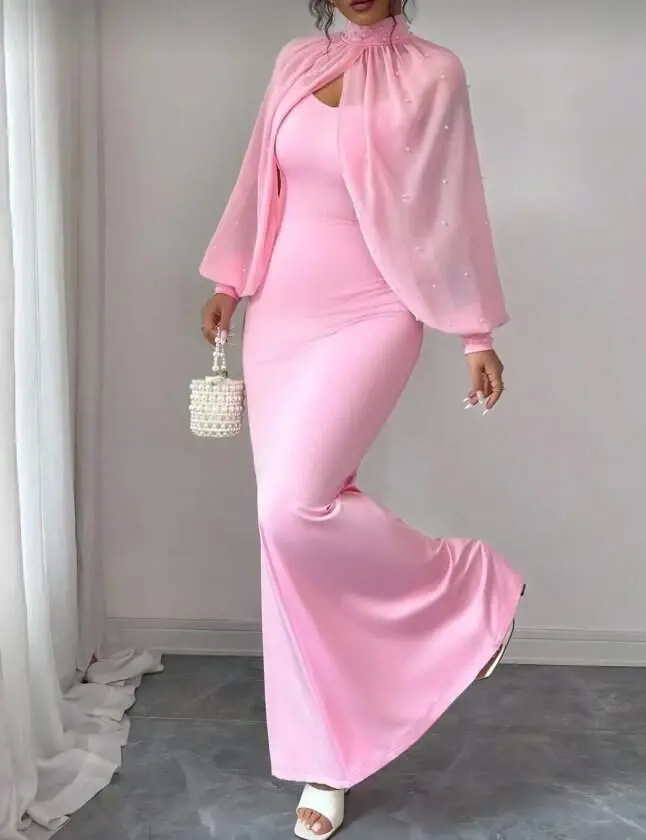 Kadın Balıkçı Yaka İnci Ve Tül Detay Dalgıç Kumaş Maxi Boy Elbise