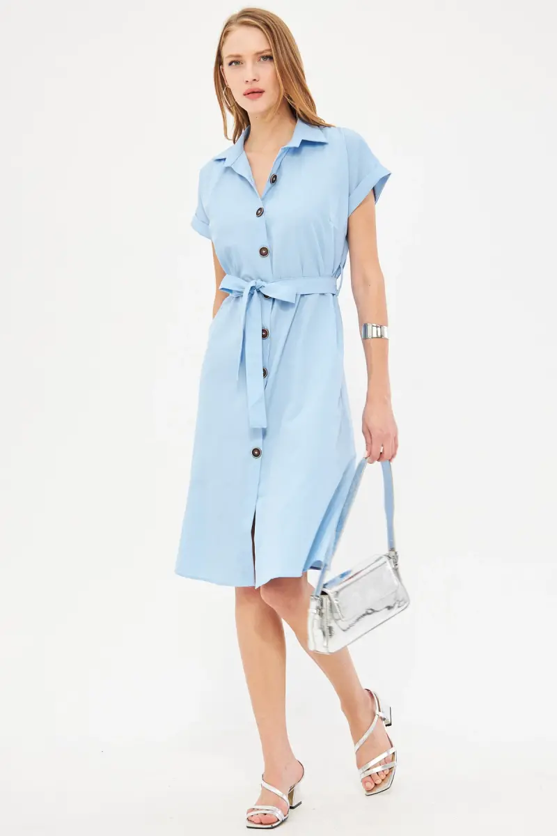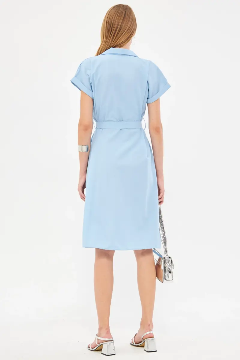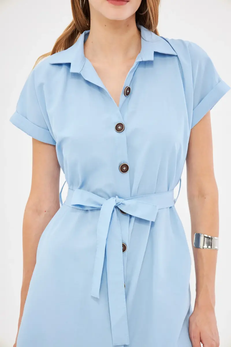 Kadın Bebe Mavi Beli Kemerli Kısa Kol Gömlek Elbise ARM-19Y001068-Bebe Mavi