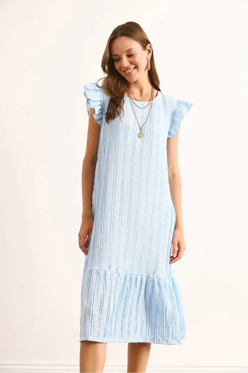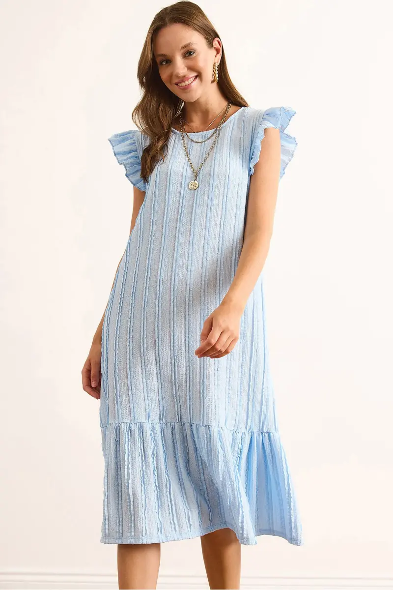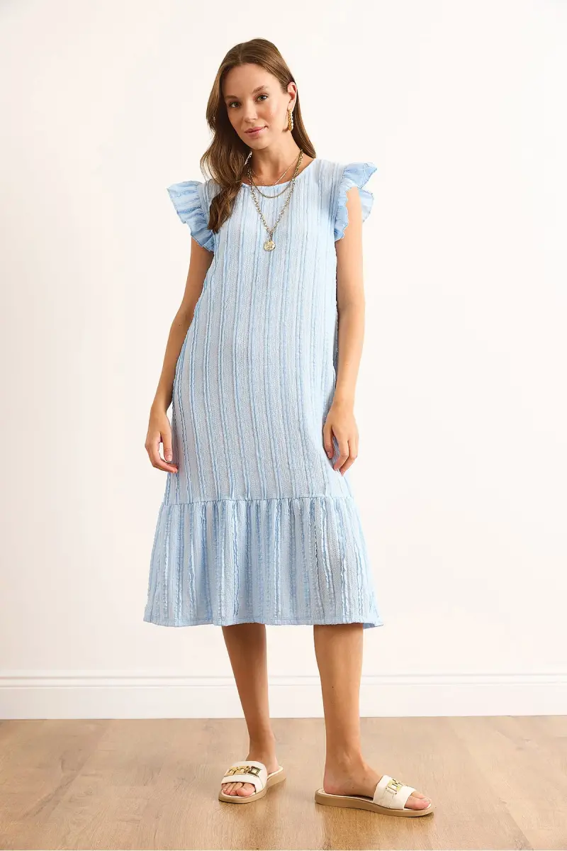 Kadın Bebe Mavi Kol Etek Fırfırlı Dokulu Midi Elbise ELB-19002364-Bebe Mavi
