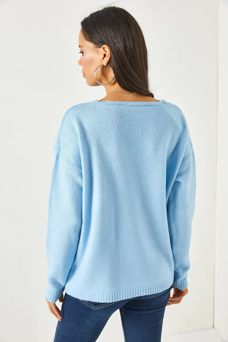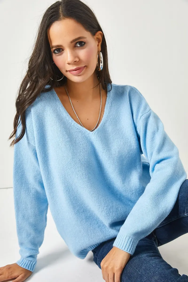 Kadın Bebe Mavi V Yaka Yumuşak Dokulu Triko Kazak KZK-19000598-Bebe Mavi