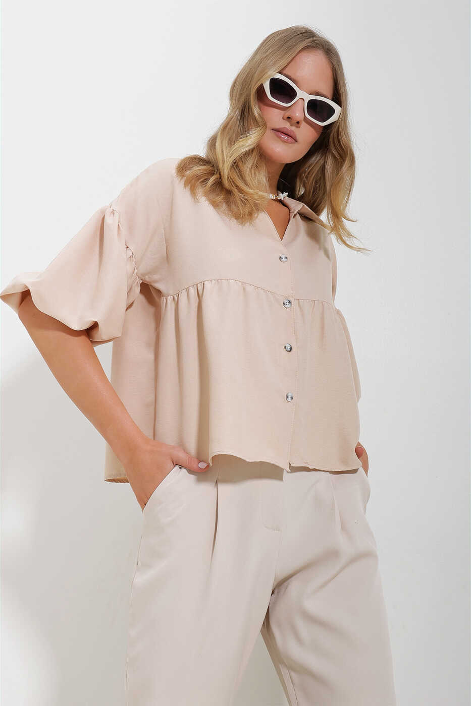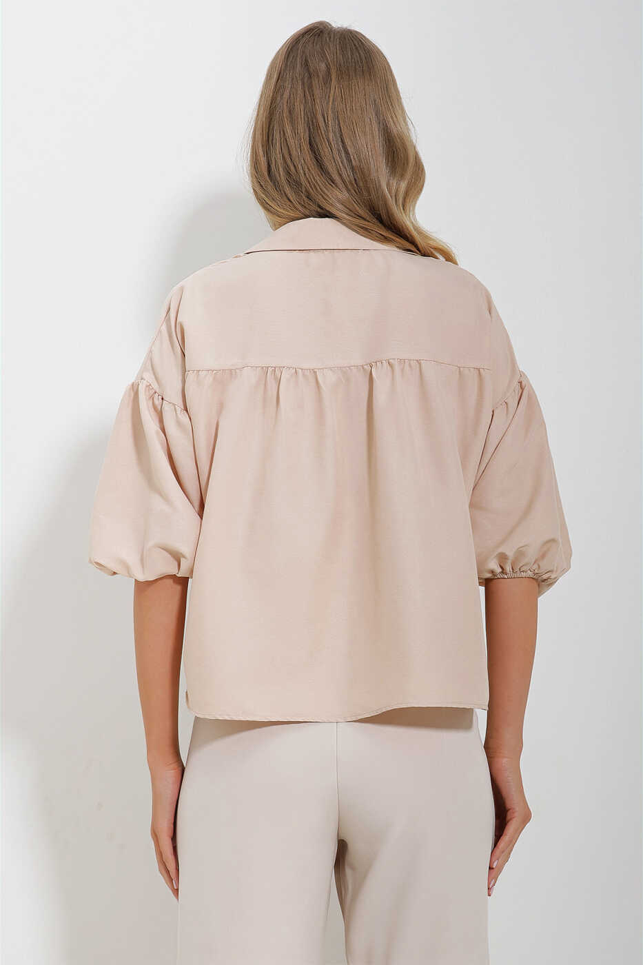 Kadın Bej Balon Kol Roba Büzgülü Kubra Pamuk Crop Gömlek ALC-X11624 ile hem şık hem de rahat hissetmeye hazır olun!