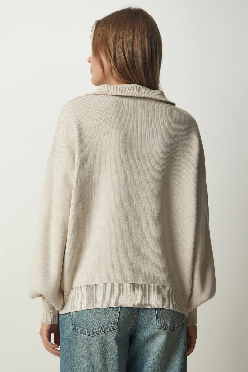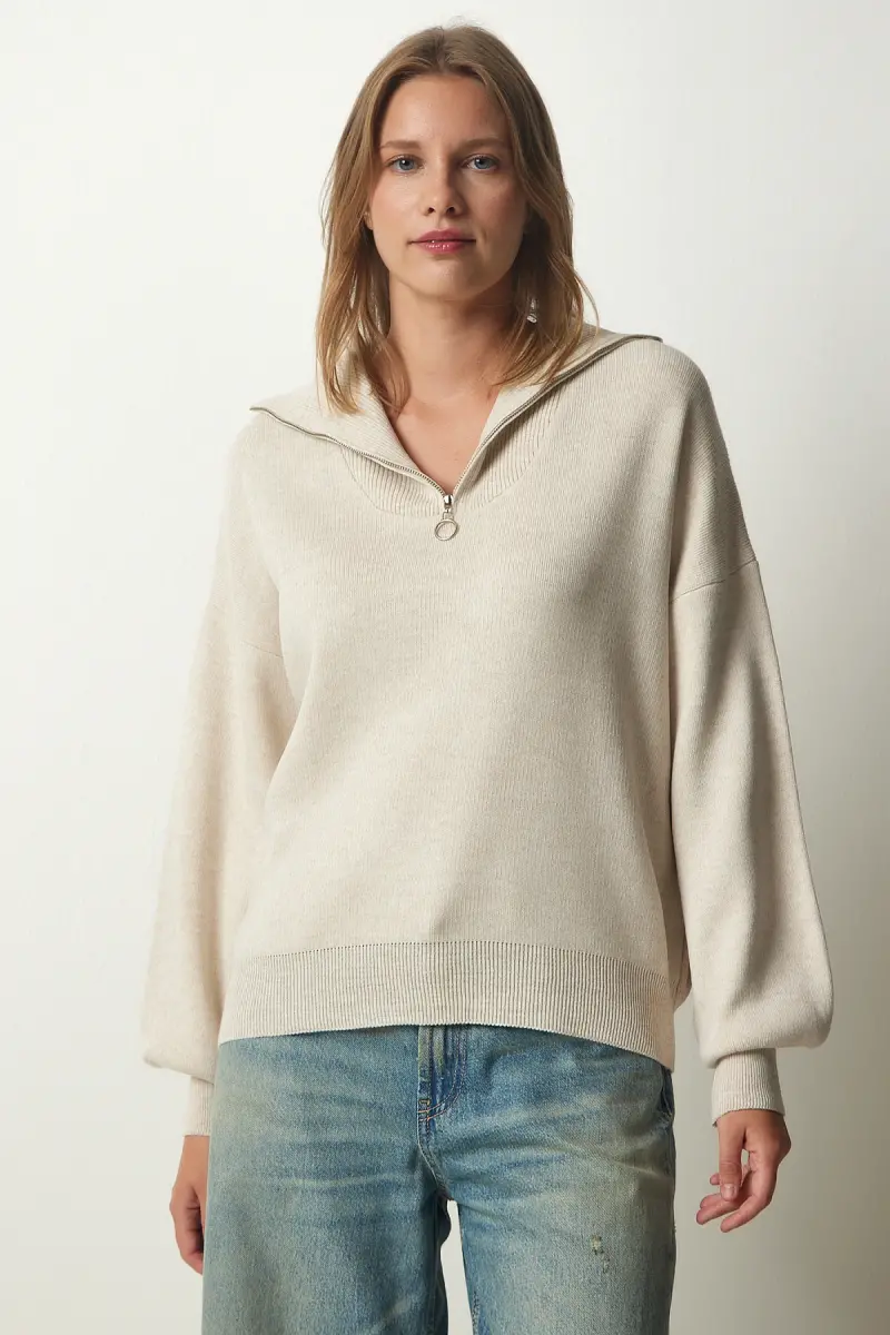Kadın Bej Fermuarlı Yaka Basic Triko Kazak PF00007-Bej