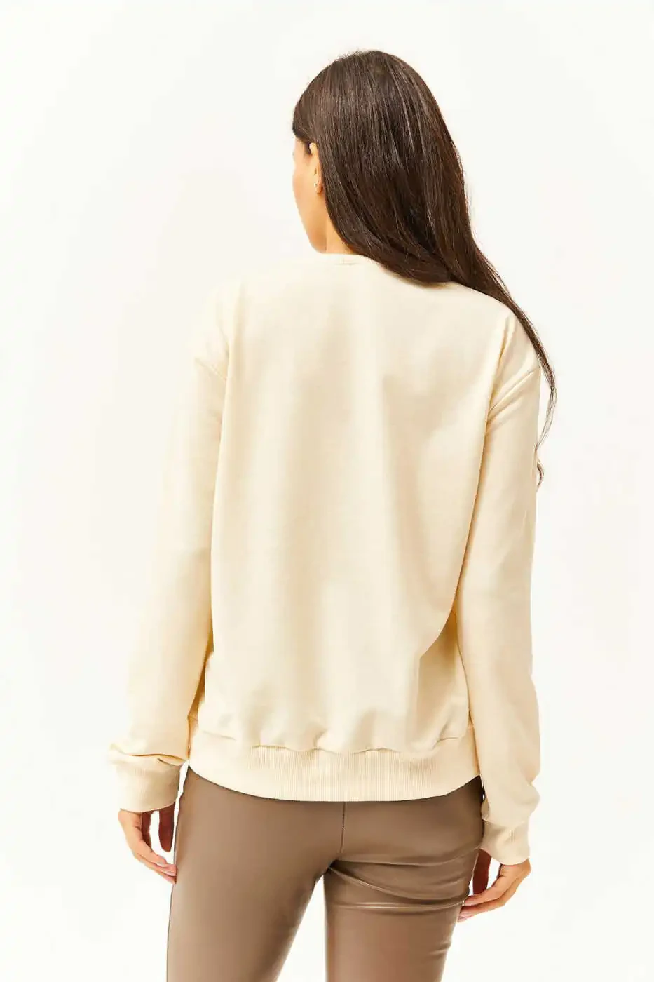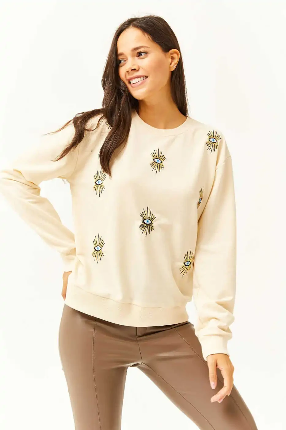 Kadın Bej Göz Nakışlı Mevsimlik Sweatshirt: Şıklık ve Konfor Bir Arada