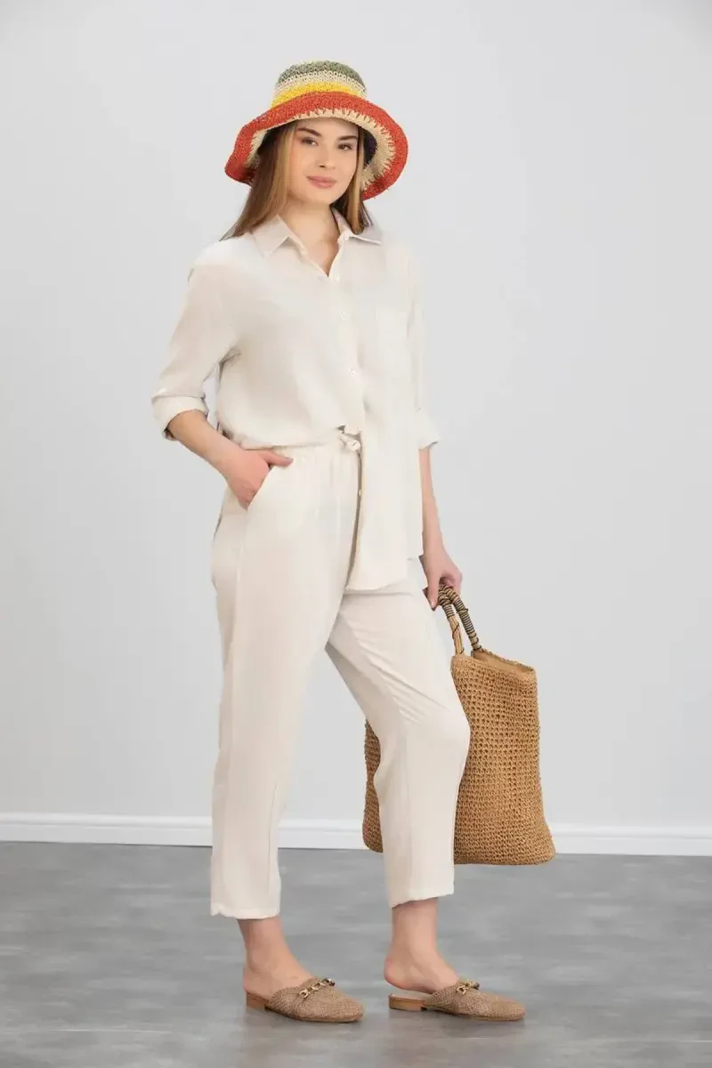 Сделайте стильный вход в летние месяцы с помощью женского комплекта из льняной рубашки и брюк бежевого цвета, сочетающего в себе стиль и комфорт! Комплект, изготовленный из легкой и дышащей льняной ткани, обеспечивает удобную носку в течение всего дня. Стильный дизайн рубашки с пуговицами и свободный крой брюк - это детали, дополняющие элегантность комплекта.