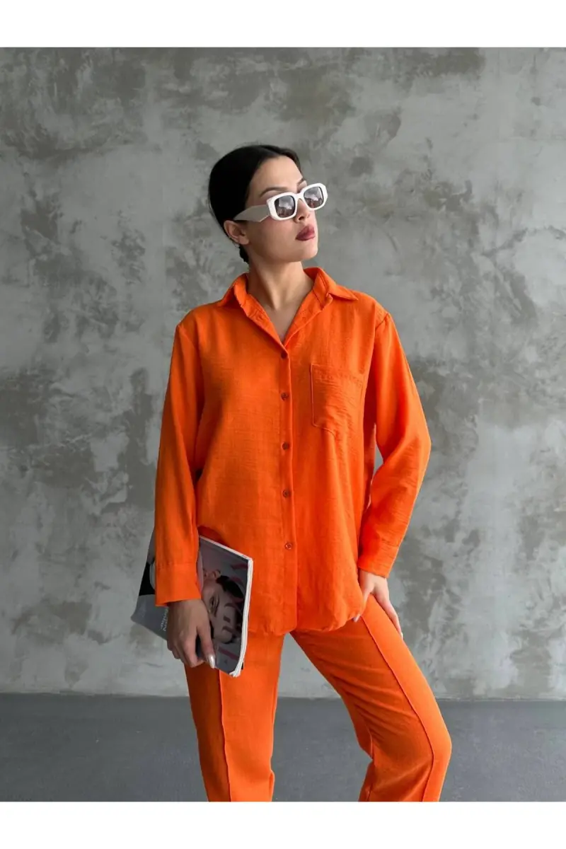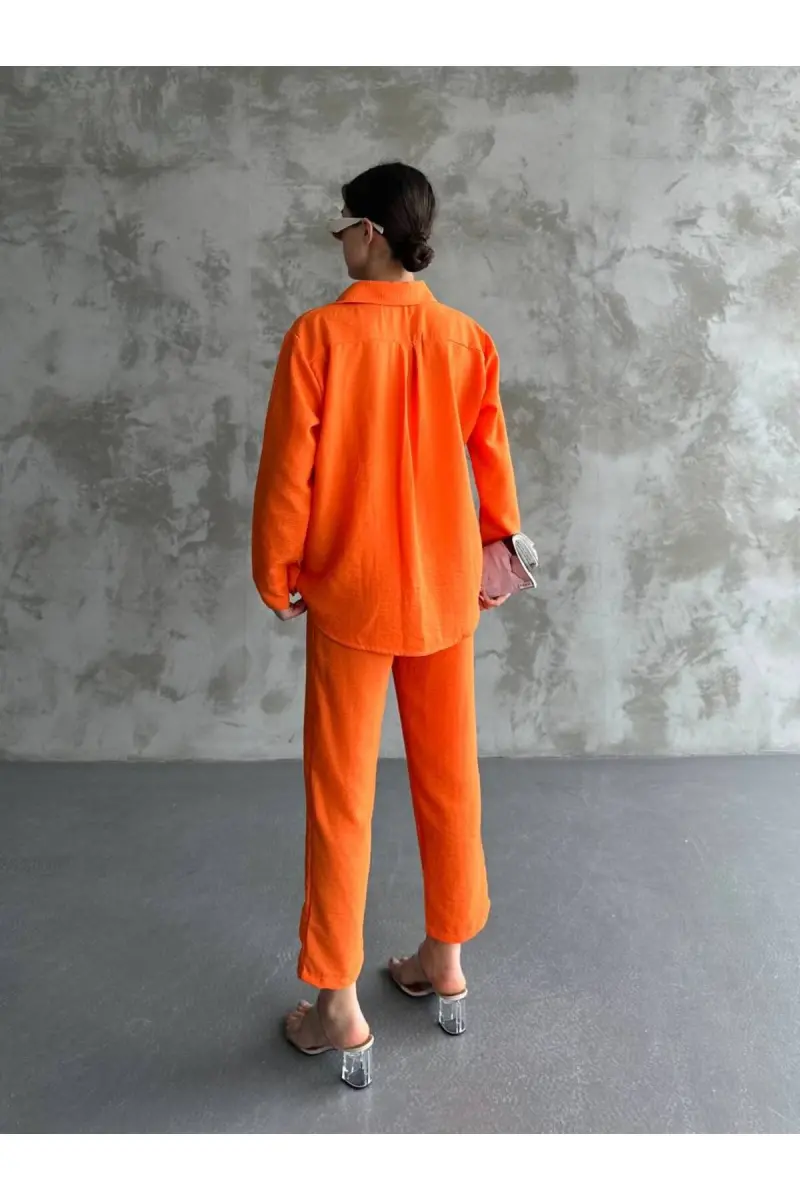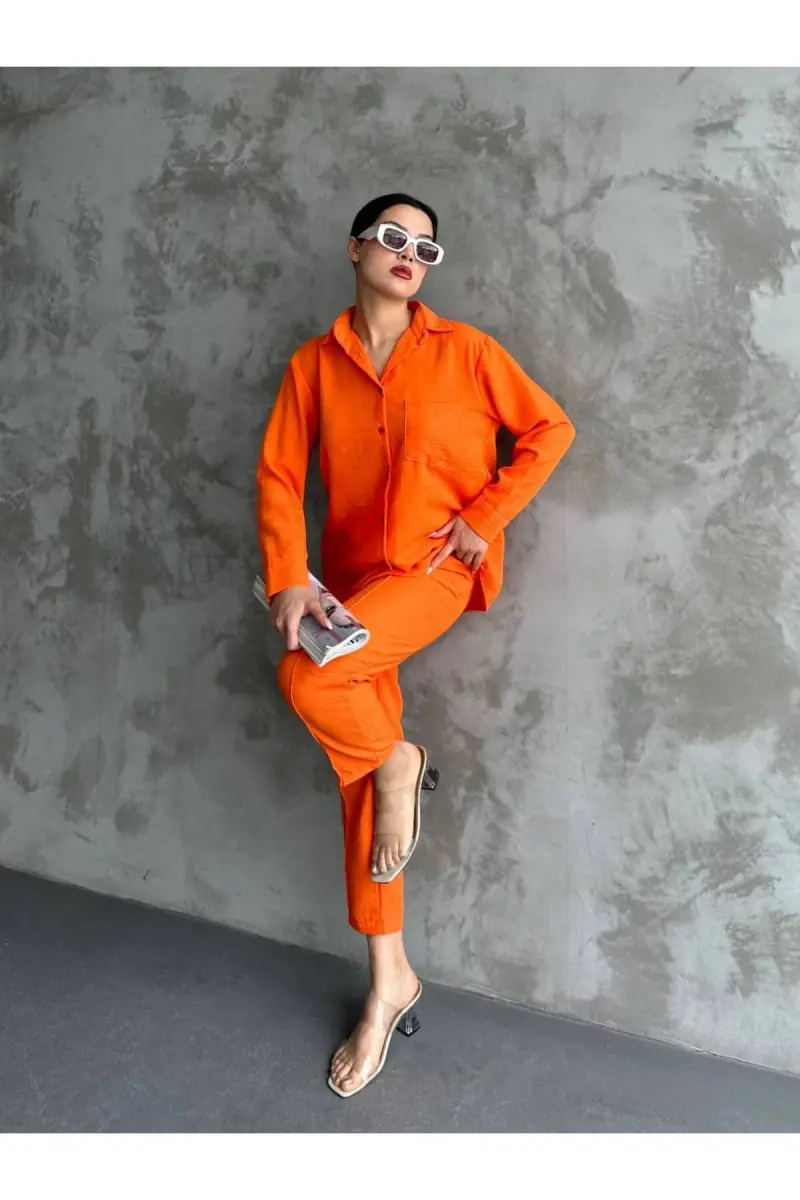 Kadın Bej Ikili Keten Gömlek Pantolon Alt Üst Takım-Turuncu