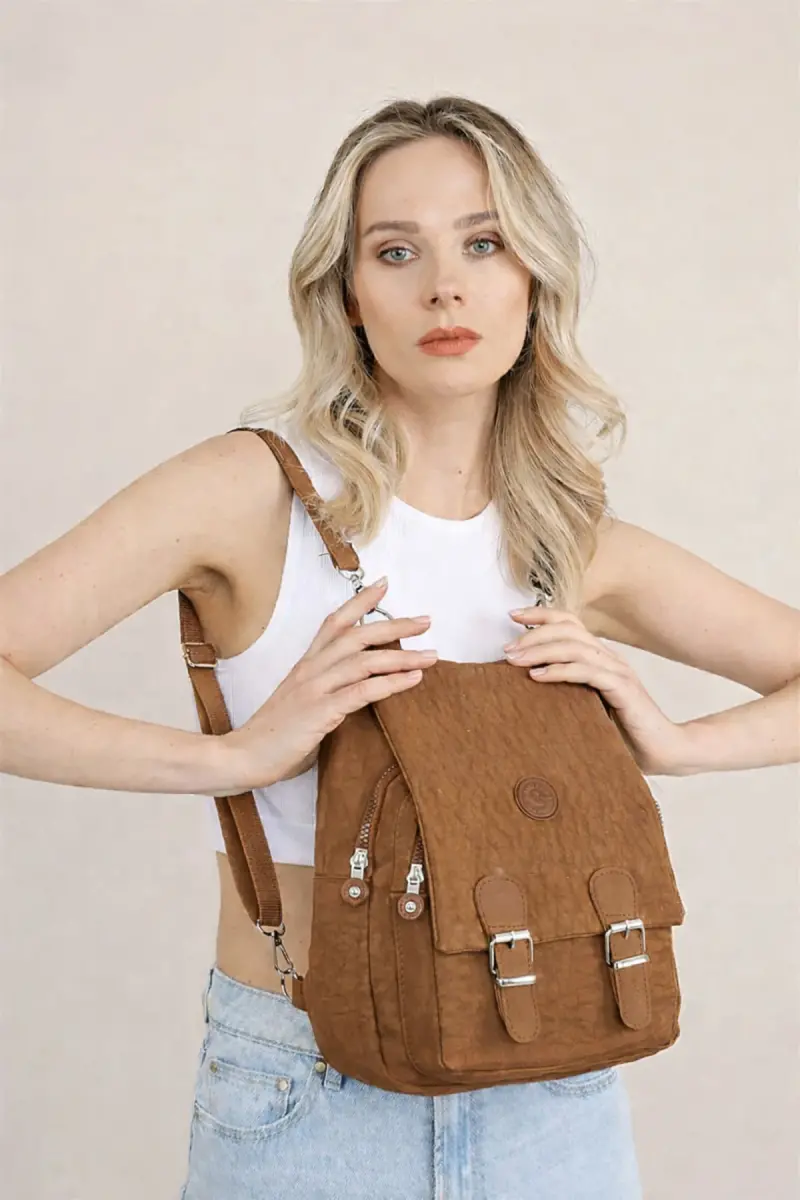 Kadın Bej Kipling Kumaş Kadın Omuz Ve Sırt Çantası-Taba