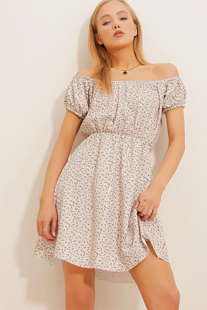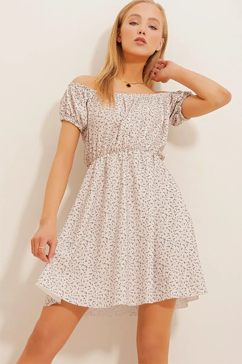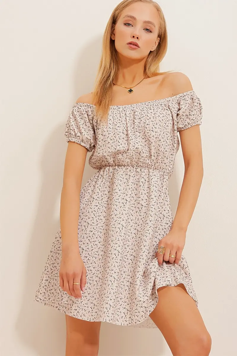 Kadın Bej Madonna Yaka Karpuz Kollu Desenli Krinkıl Örme Elbise Alc-X10516-Bej
