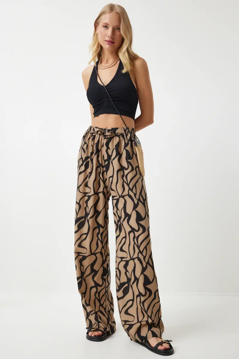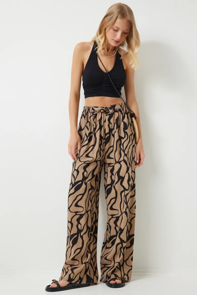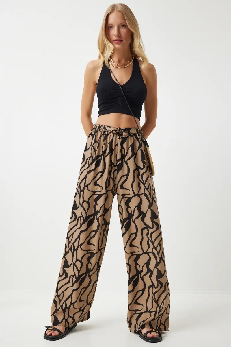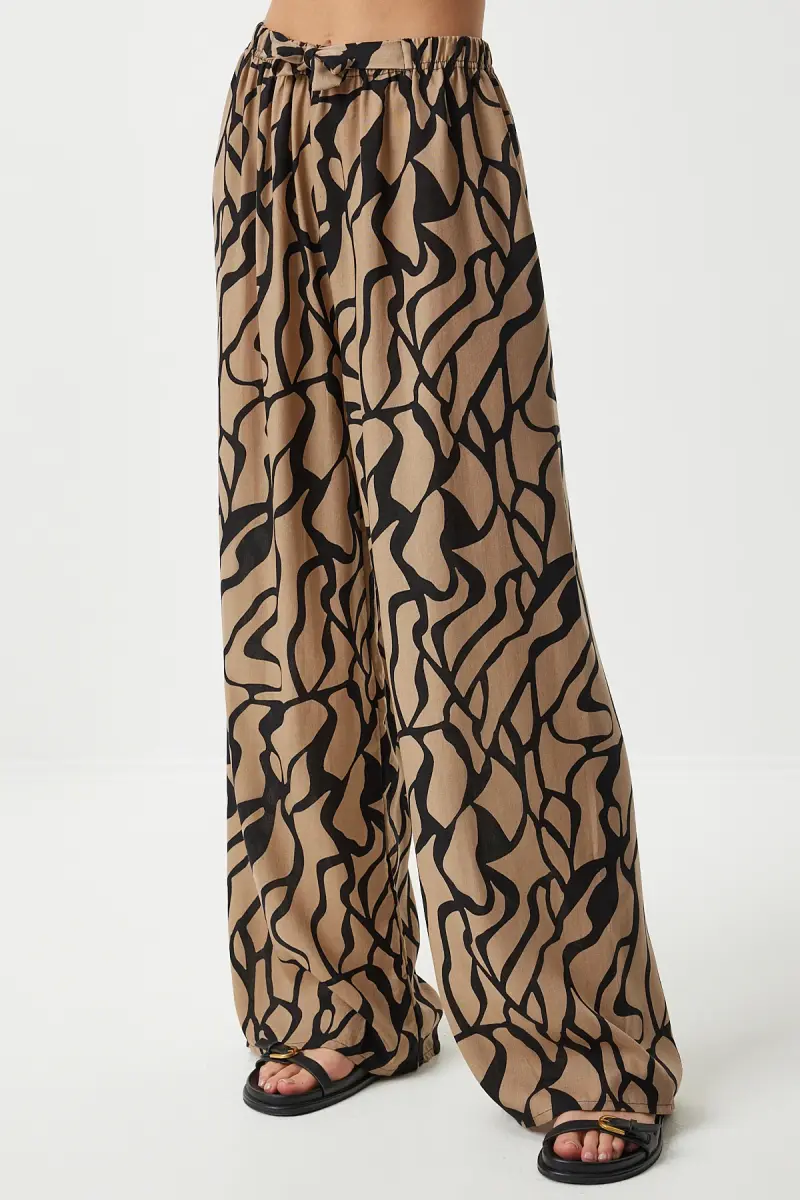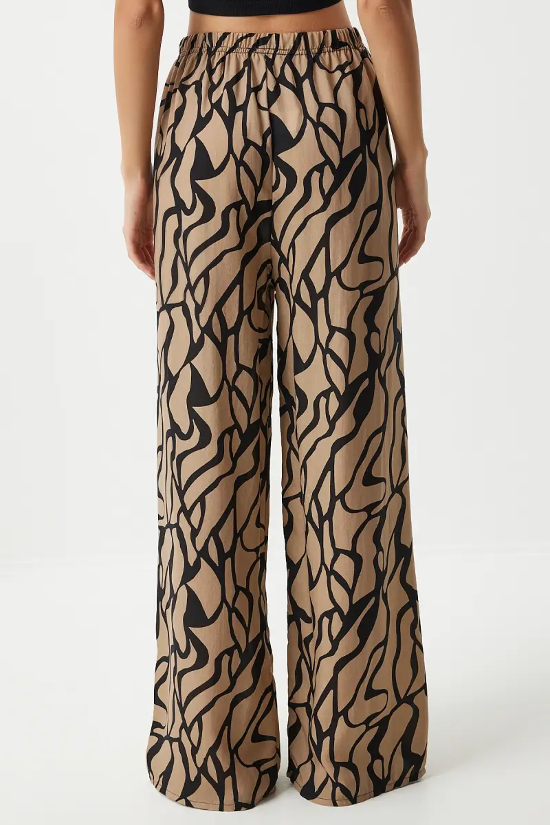 Kadın Bej Siyah Desenli Dökümlü Viskon Palazzo Pantolon EN00606-Bej Siyah