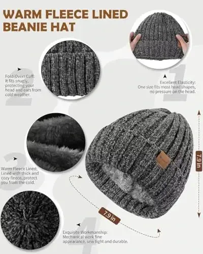 Women Beanie Scarf Gloves Headband Set, Chenille Winter Hats Fleece Lined Ear Warmer Knit Scarf Touchscreen Gloves 4 Gift Set