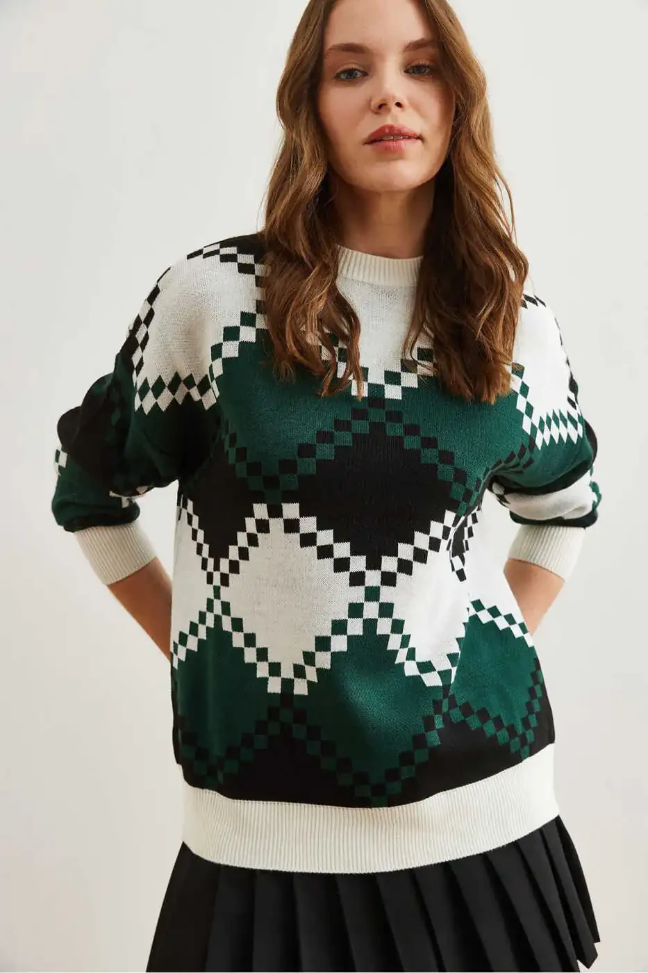 Women's White Baklava Patterned Oversize Knitted Sweater: Style and Comfort Combined