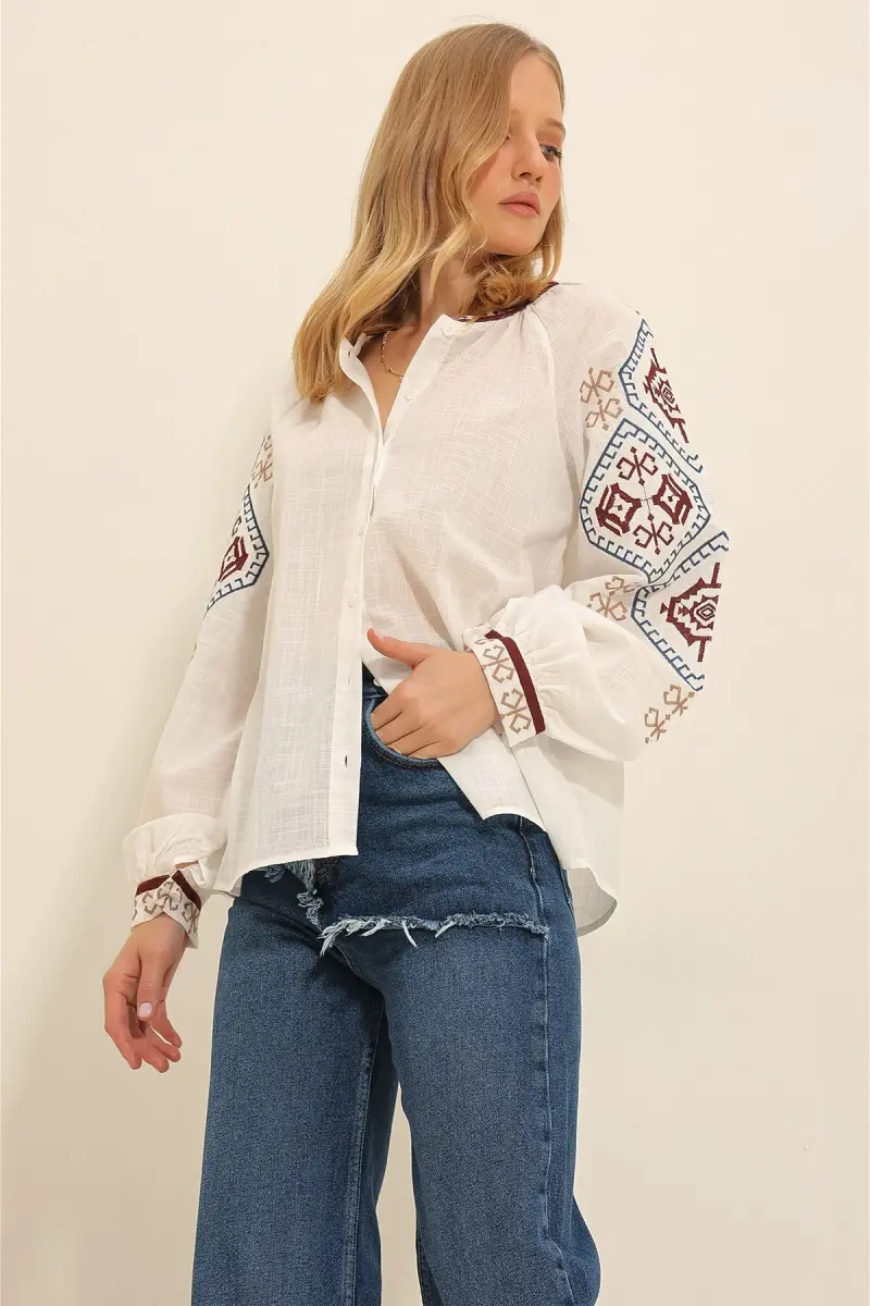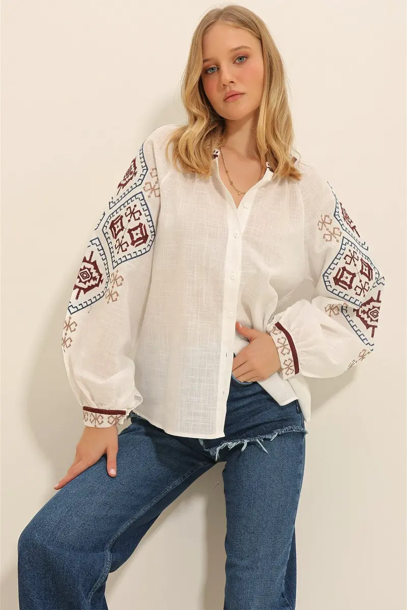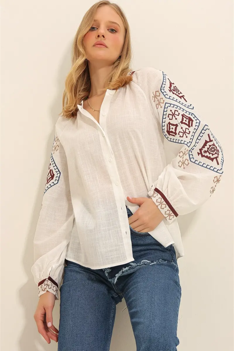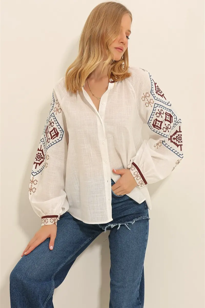 Kadın Beyaz Balon Kol Nakışlı Yakasız Gömlek Alc-X11290-BEYAZ