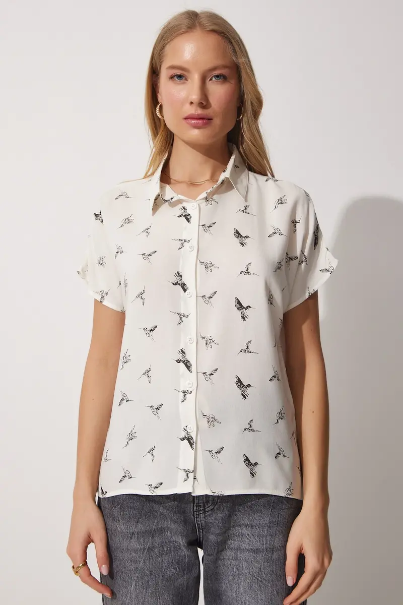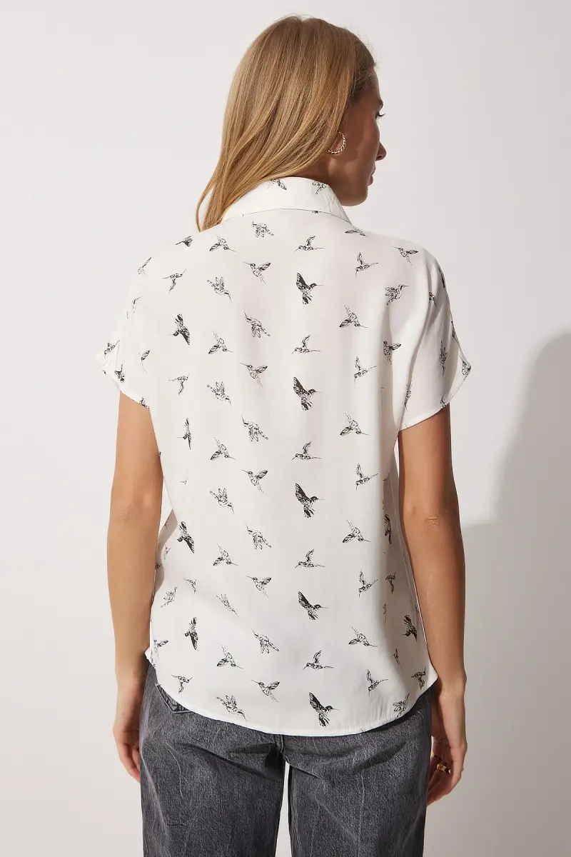 Kadın Beyaz Çiçek Desenli Kısa Kollu Viskon Gömlek BH00408-Beyaz