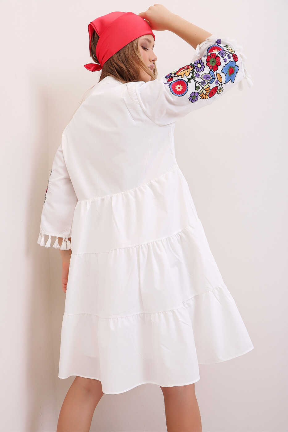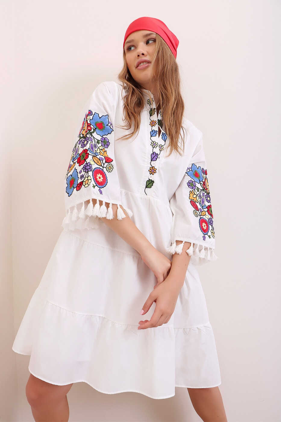 Kadın Beyaz Hakim Yaka Nakış İşlemeli Püskül Detaylı İçi Astarlı Poplin Elbise ALC-X6915