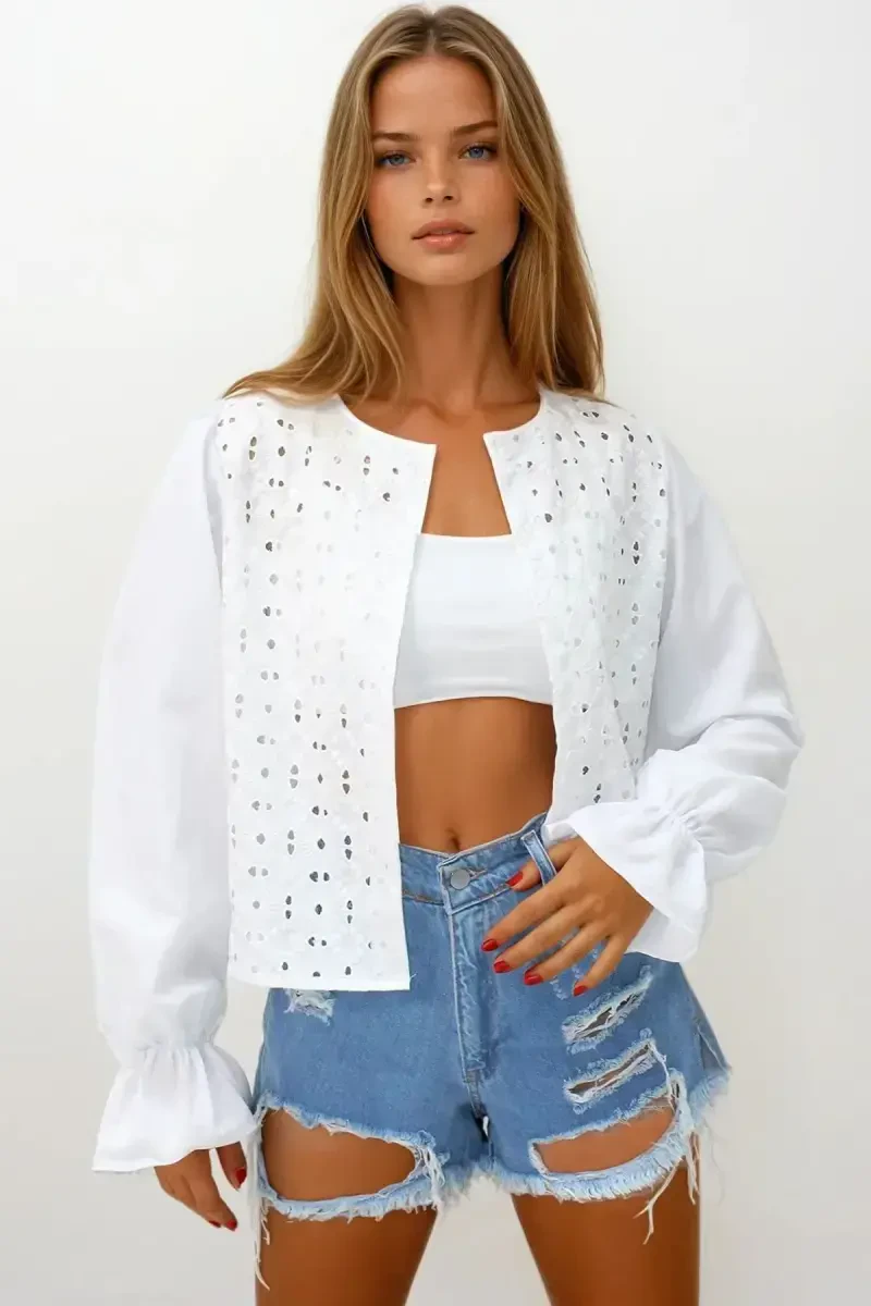 Kadın Beyaz Prenses Kol Kolları Volanlı Güpür Dokuma Gömleği hemen sipariş edin ve özel günlerinizi unutulmaz kılın!