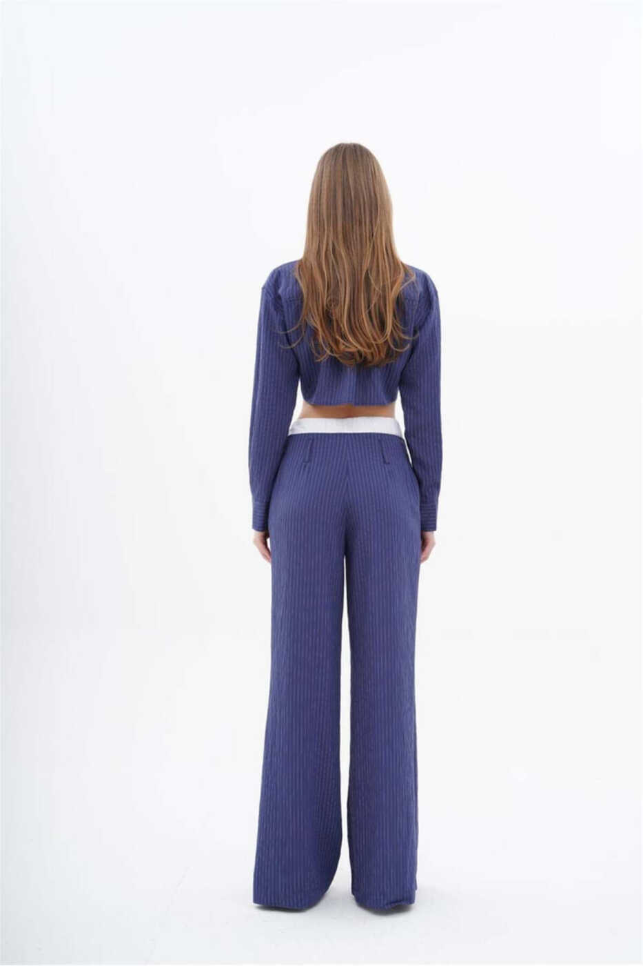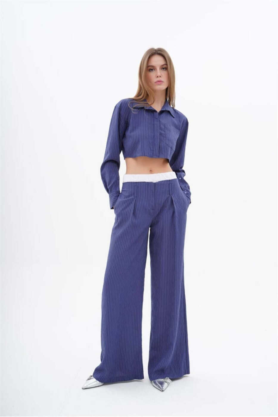 crop gömlek takım, kadın takım elbise, bol paça pantolon, çizgili takım, lacivert takım, günlük giyim, şık takım, rahat takım, kadın giyim, yazlık takım, moda