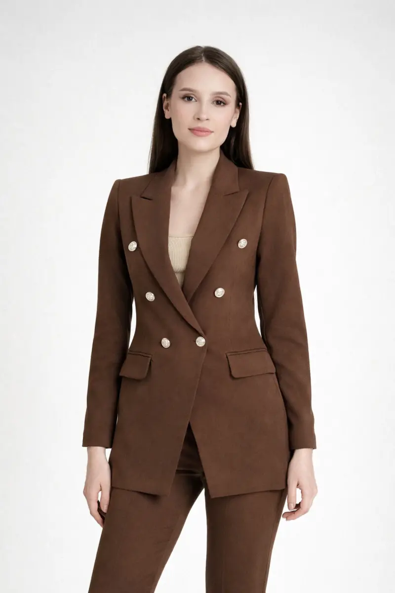 Kadın Blazer Ceket Kemerli Pantolon Takım Kahverengi-Kahverengi
