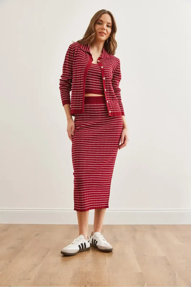 Bordo Triko Takım | Çizgili 3'lü Kombin | S-M-L Beden | Akrilik Yün Karışımı