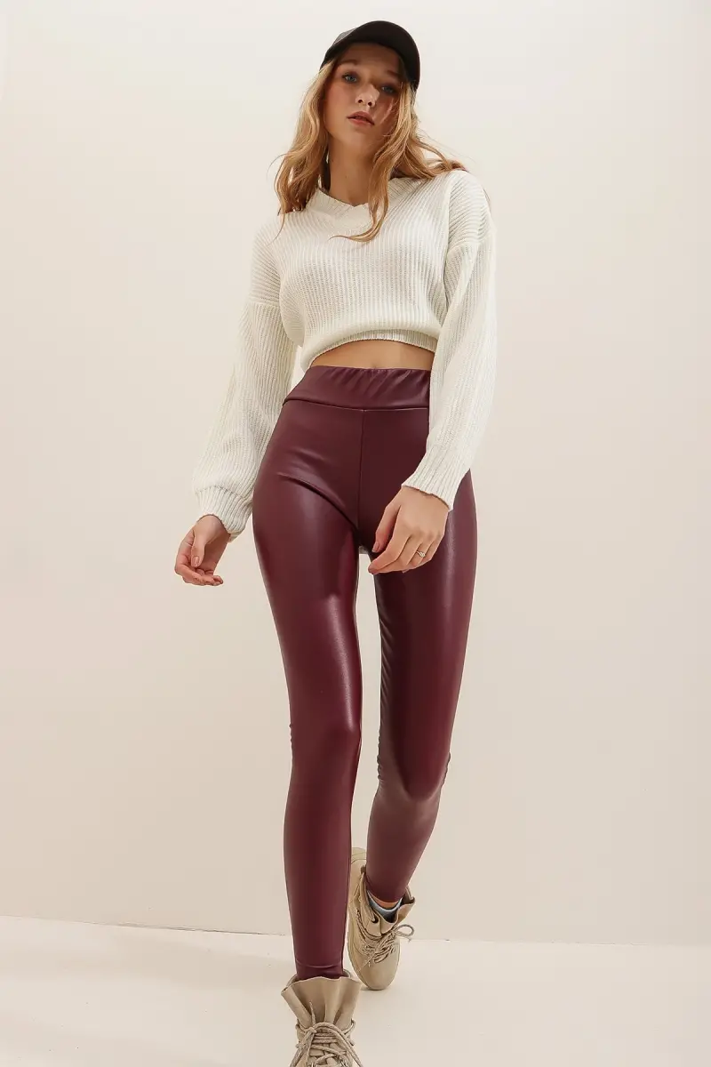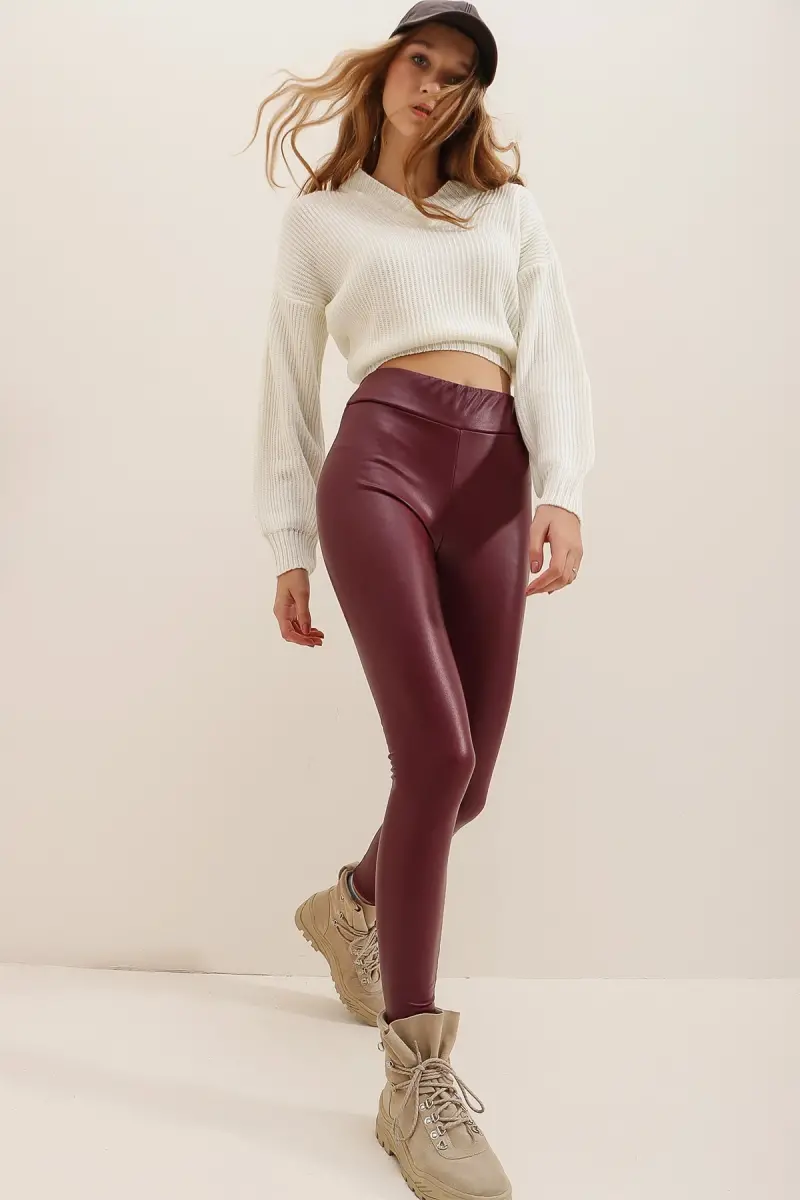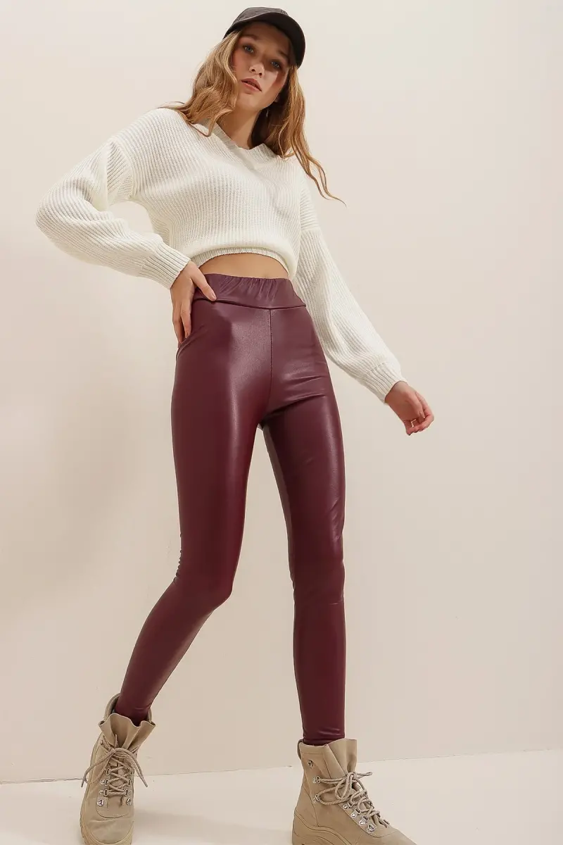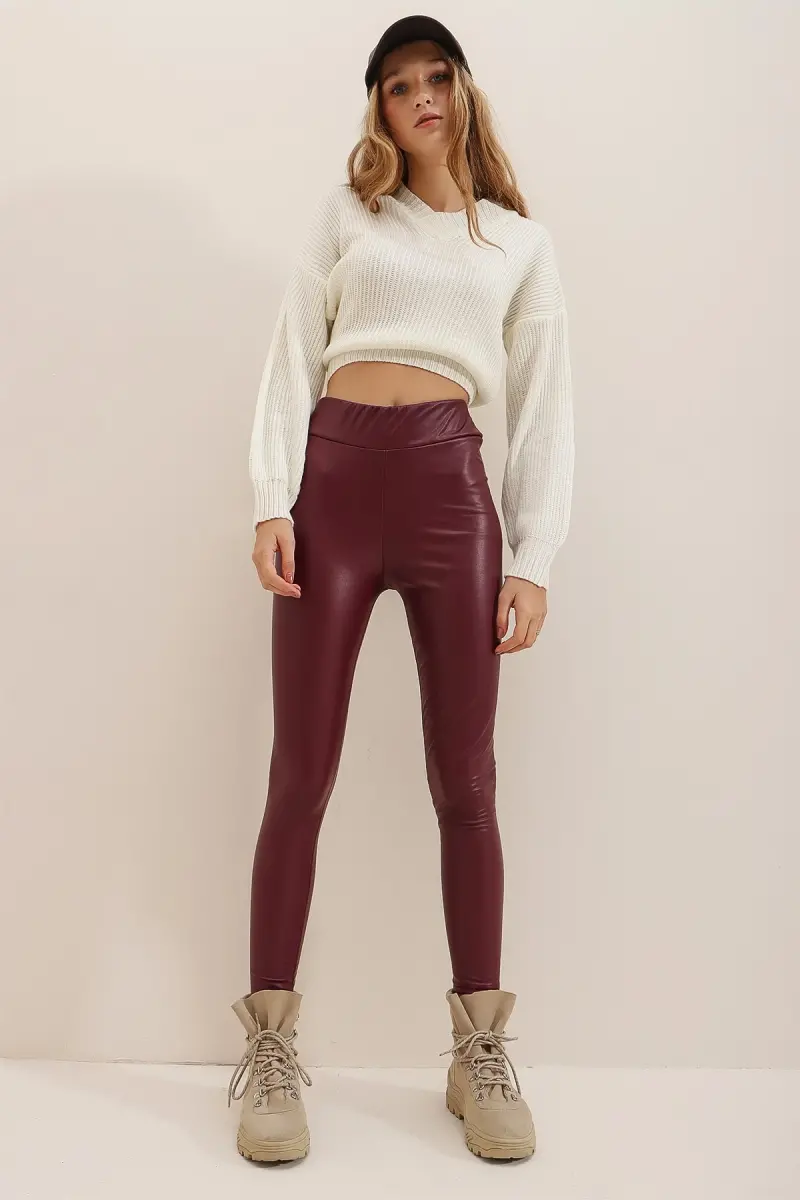 Kadın Bordo Beli Lastikli İçi Şardonlu Likralı Suni Deri Tayt Alc-X7327-BORDO