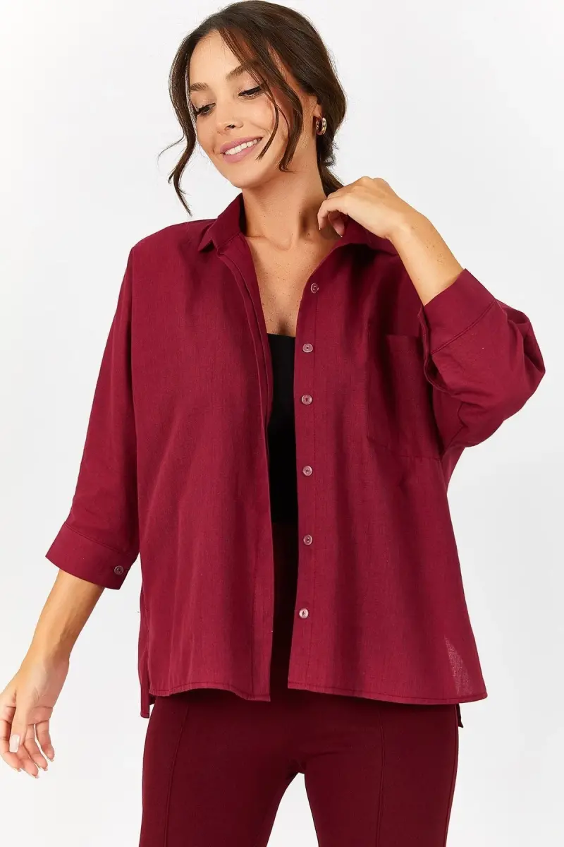 Kadın Bordo Cepli Salaş Keten Gömlek ARM-21Y001035-Bordo