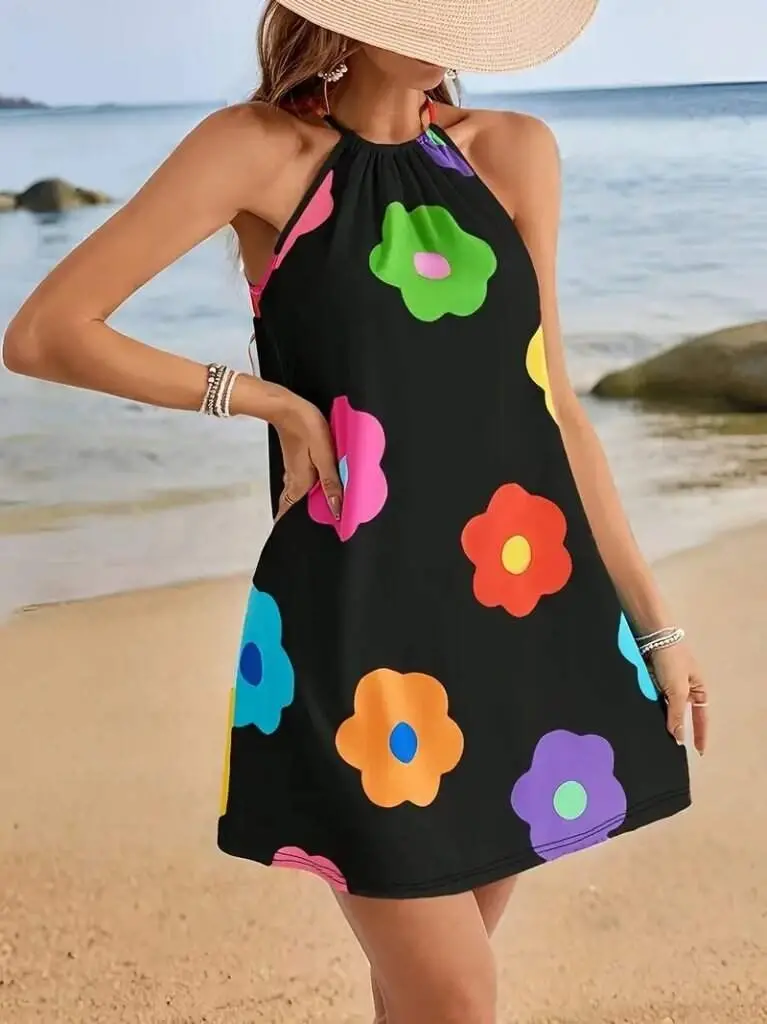 Kadın Boyundan Askılı Kolsuz çiçek Desenli Süprem Elbise