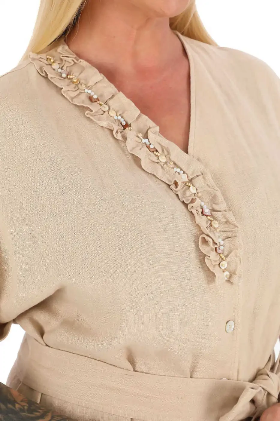 Yaz aylarının vazgeçilmezi olacak bu şık ve rahat elbiseyle kendinizi özgür ve stil sahibi hissedin! %100 keten kumaştan üretilen elbise, nefes alabilir yapısıyla sıcak havalarda serin kalmanızı sağlar. V yaka detayı ve fırfır detaylarıyla feminen bir görünüm kazandıran elbise, büyük beden seçenekleriyle her bedene mükemmel uyum sağlar.