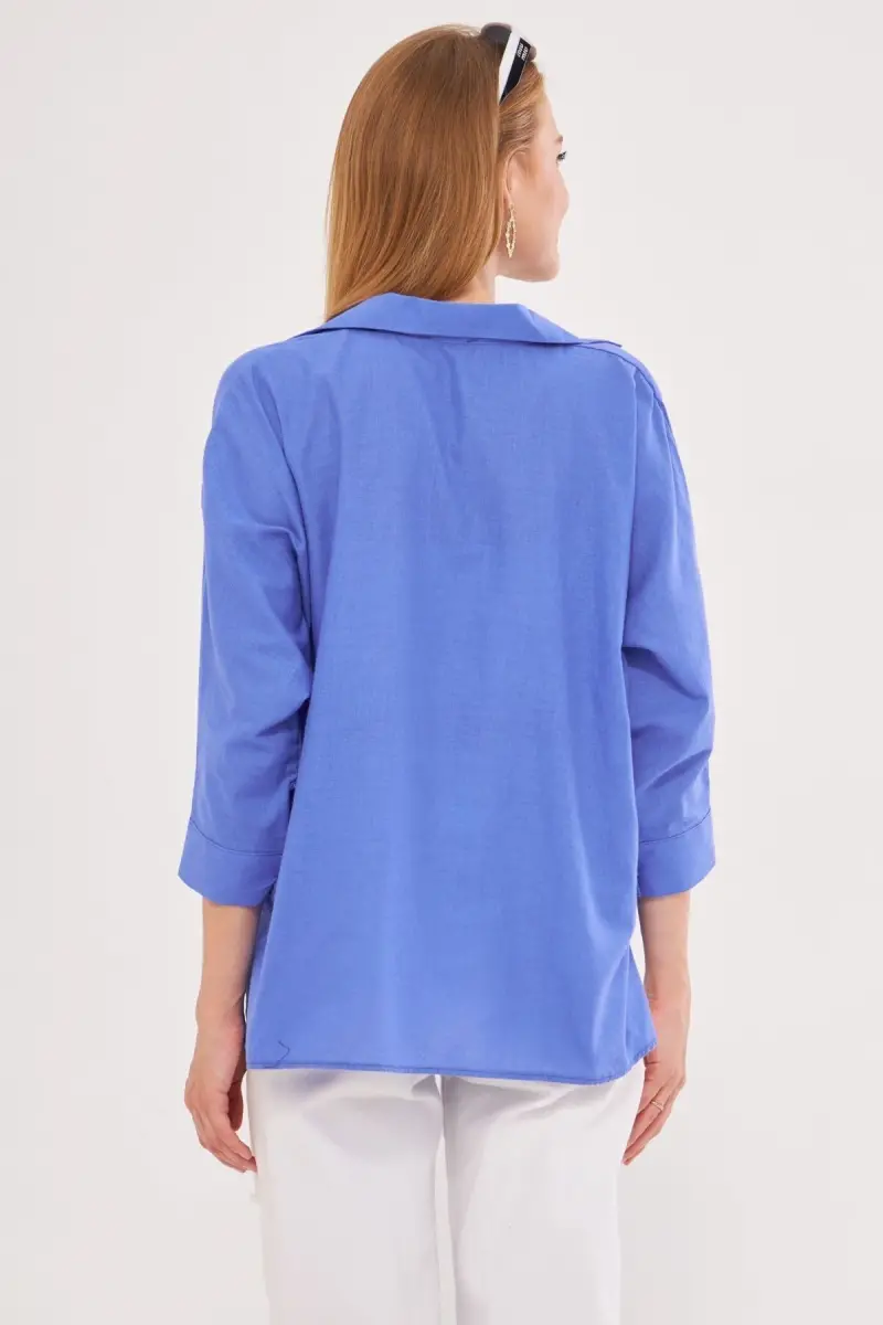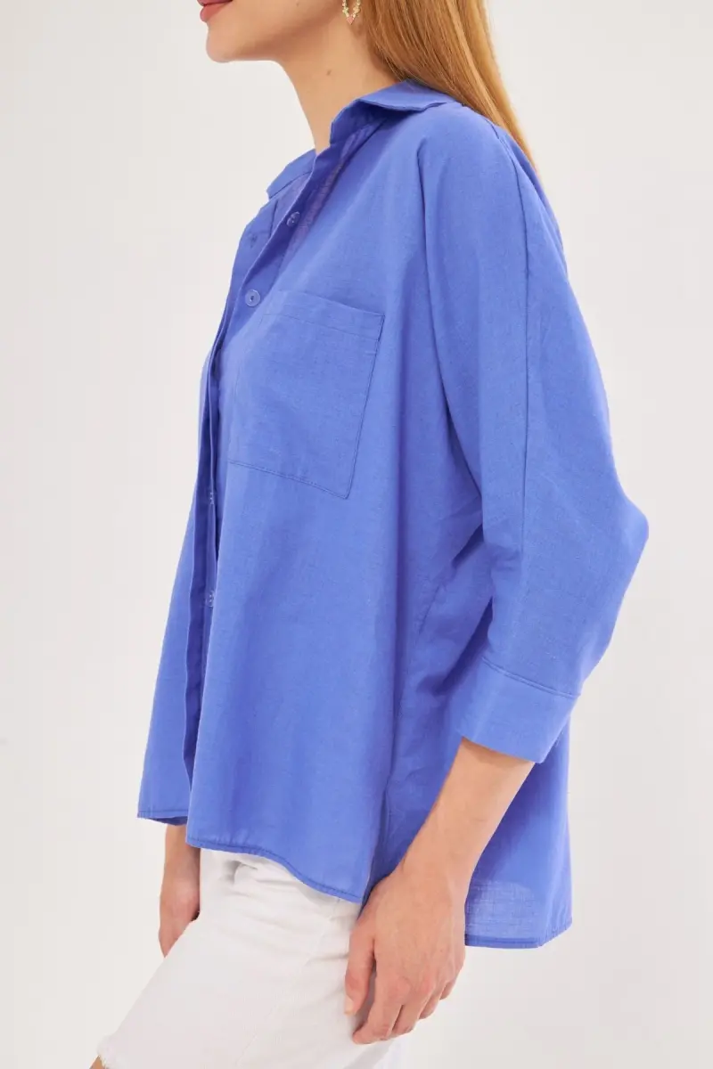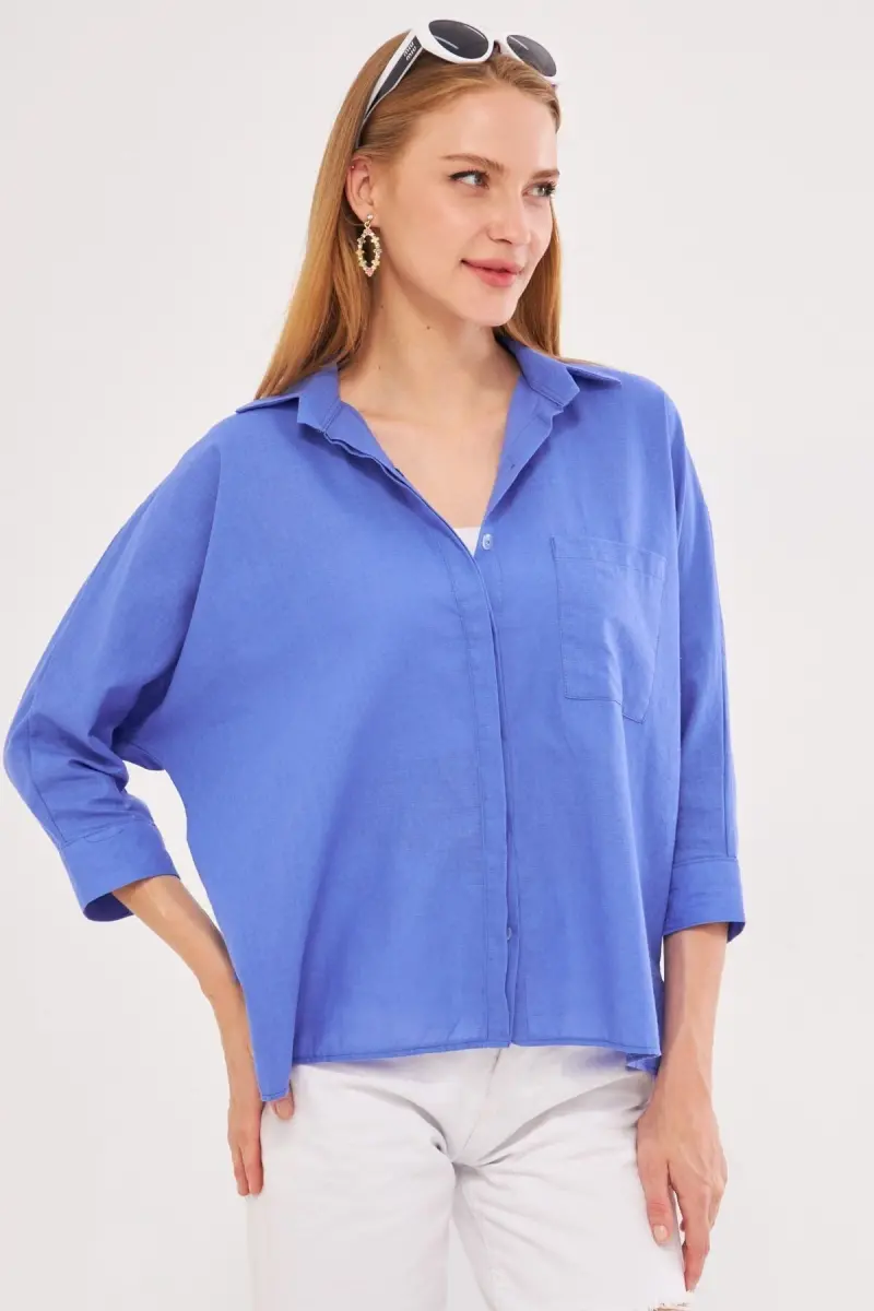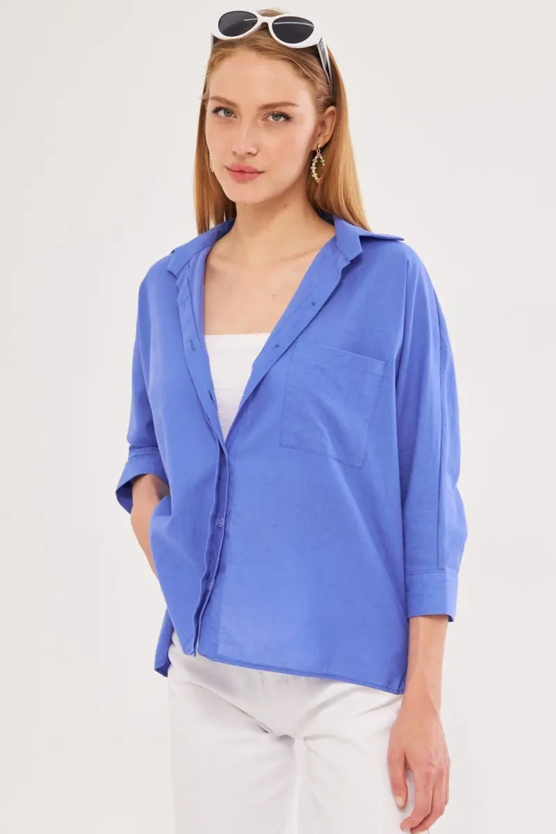 Kadın Buzmavi Cepli Salaş Keten Gömlek ARM-21Y001035-Buzmavi