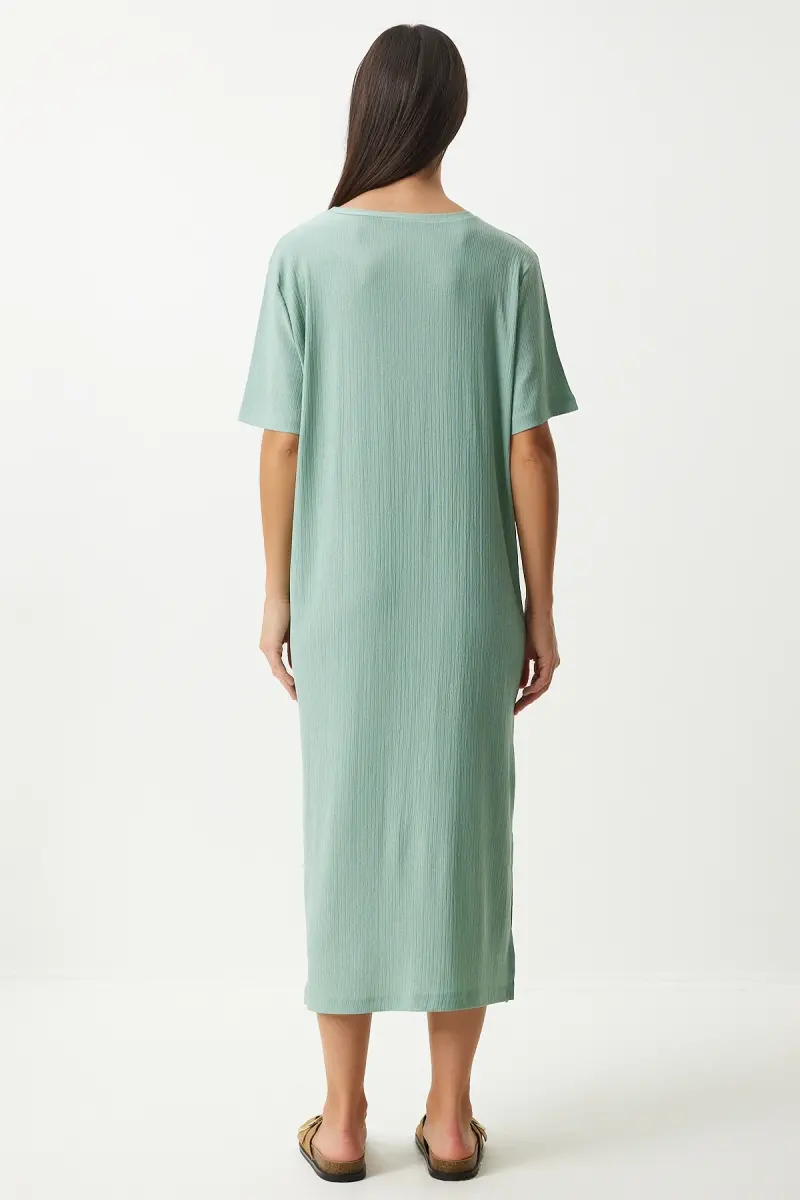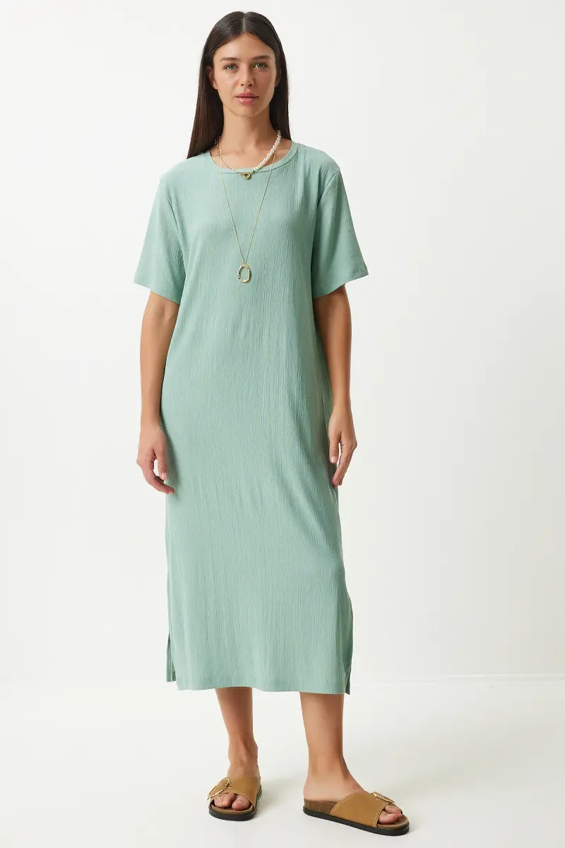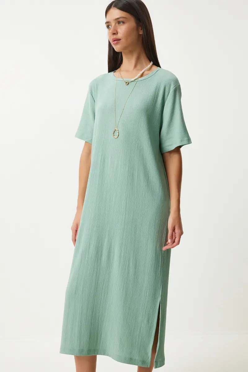 Bu ürün Trendyol tarafından gönderilecektir.Kampanya fiyatından satılmak üzere 100 adetten fazla stok sunulmuştur.İncelemiş olduğunuz ürünün satış fiyatını satıcı belirlemektedir.Bir ürün, birden fazla satıcı tarafından satılabilir. Birden fazla satıcı tarafından satışa sunulan ürünlerin satıcıları ürün için belirledikleri fiyata, satıcı puanlarına, teslimat statülerine, ürünlerdeki promosyonlara, kargonun bedava olup olmamasına ve ürünlerin hızlı teslimat ile teslim edilip edilememesine, ürünlerin stok ve kategorileri bilgilerine göre sıralanmaktadır.Bu üründen en fazla 11 adet sipariş verilebilir. 11 adedin üzerindeki siparişleri Trendyol iptal etme hakkını saklı tutar. Belirlenen bu limit kurumsal siparişlerde geçerli olmayıp, kurumsal siparişler için farklı limitler belirlenebilmektedir.15 gün içinde ücretsiz iade. Detaylı bilgi için [page="return_conditions"]tıklayın .Polyester kumaş yapısı sayesinde uzun süreli kullanımda bile formunu koruyan ve rahat bir deneyim sunan kadın elbiseSade ve şık tasarımıyla her ortamda rahatlıkla tercih edilebilen düz desenli, çağla yeşili renkli elbiseGünlük kullanım için ideal olan bu elbise, konforlu ve pratik bir stil vurgusu sağlarYırtmaç detayı ile modern ve dinamik bir görünüm kazandırırken, hareket özgürlüğü sunarBisiklet yaka tasarımı ile zarif bir boyun hattı oluştururken, her türlü aksesuarla kolayca kombinlenebilirÖrme kumaş tipi sayesinde esneklik ve yumuşaklık hissi verir%95 polyester ve %5 elastan içeriği ile konforlu bir kullanım sağlarTüm yaş gruplarına hitap eden geniş beden skalasıyla herkes için uygunluk sunarYırtmaçlı kalıbı sayesinde modern ve trend bir siluet çizerken, fitilli dokuma tipi ile göz alıcı detaylar eklerStandart kol tipi