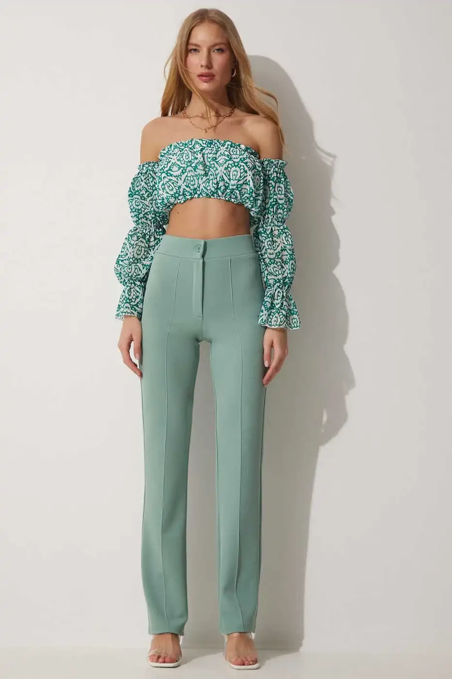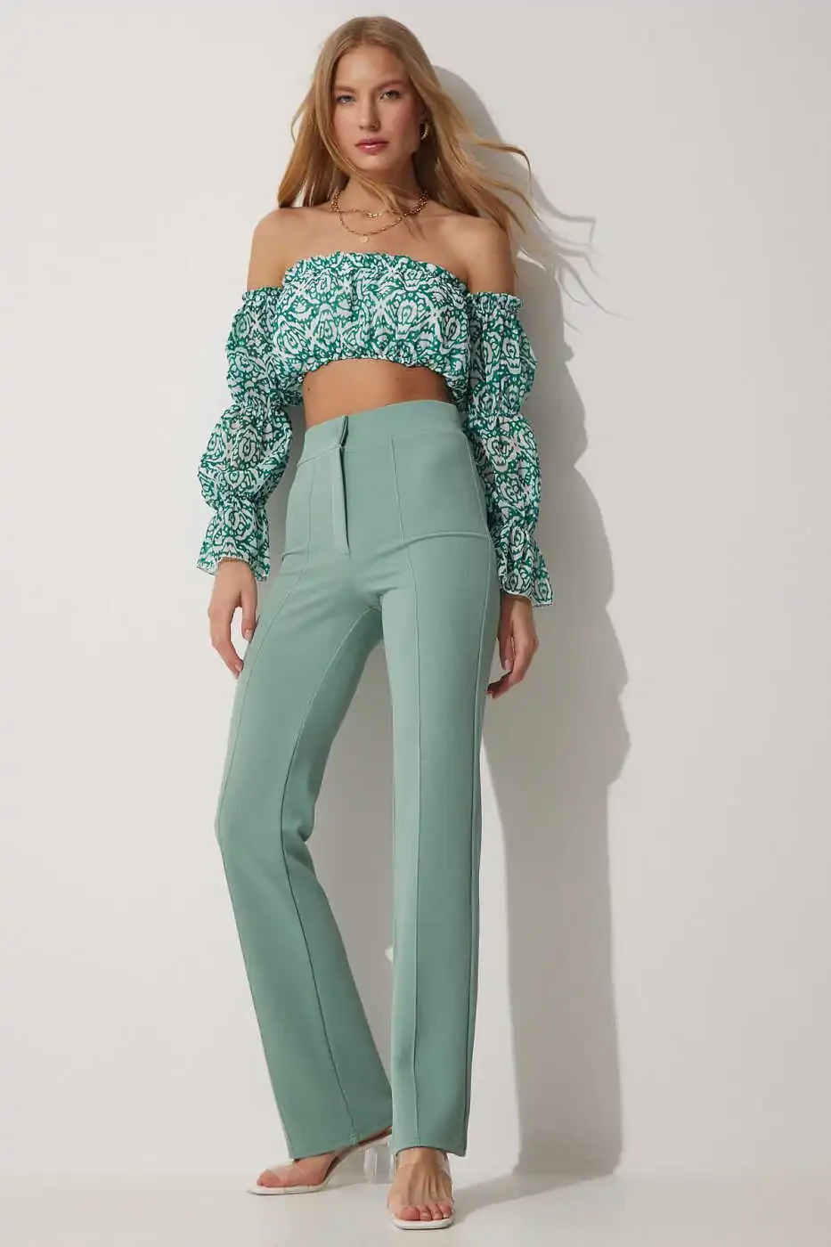 kadın pantolon, çağla yeşili pantolon, yüksek bel pantolon, likralı pantolon, rahat pantolon, örme pantolon, kadın giyim, yeşil pantolon, likralı yüksek bel, rahat örme pantolon