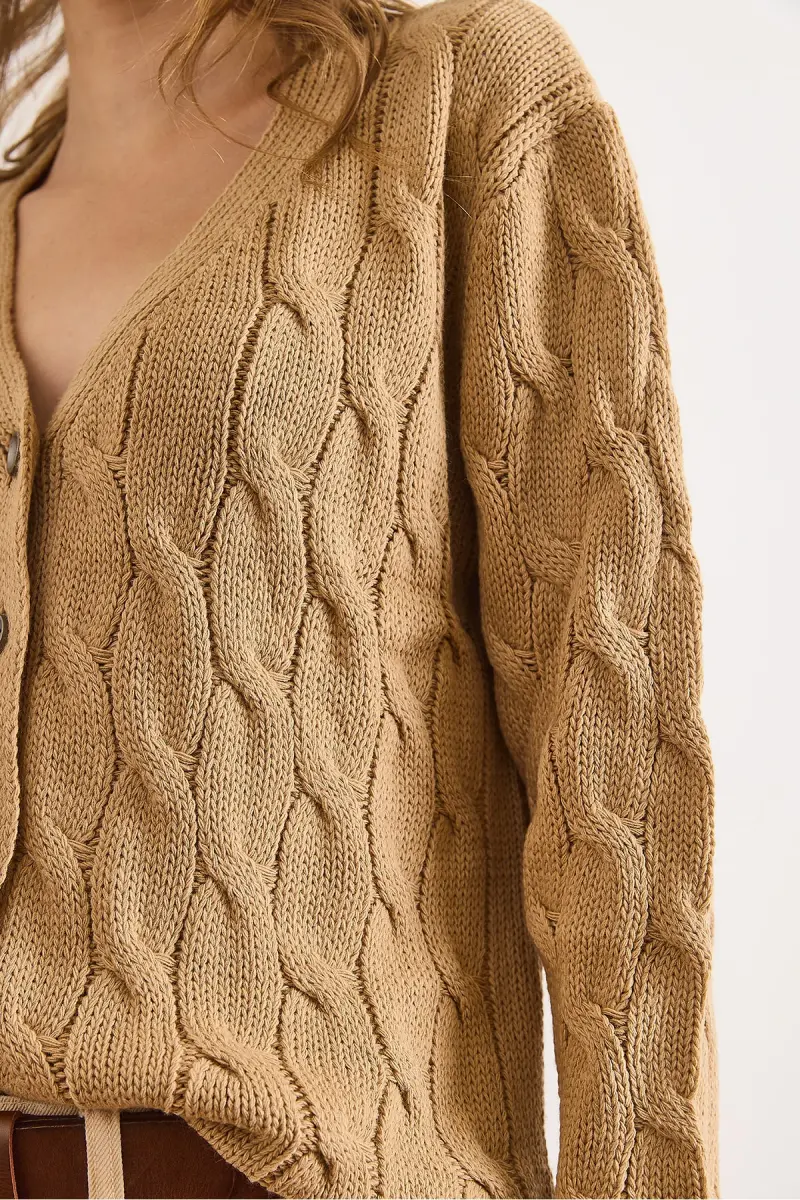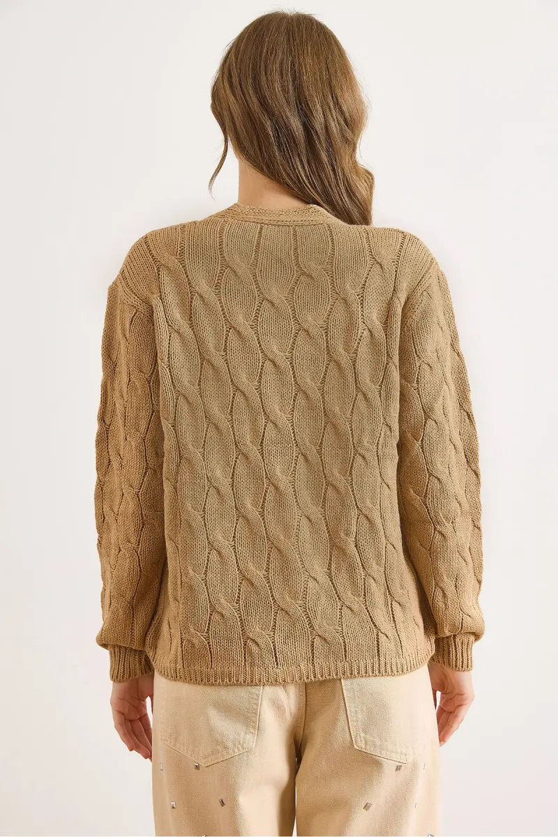Kadın Camel Saç Örgülü Triko Hırka HRK-19000298-Camel