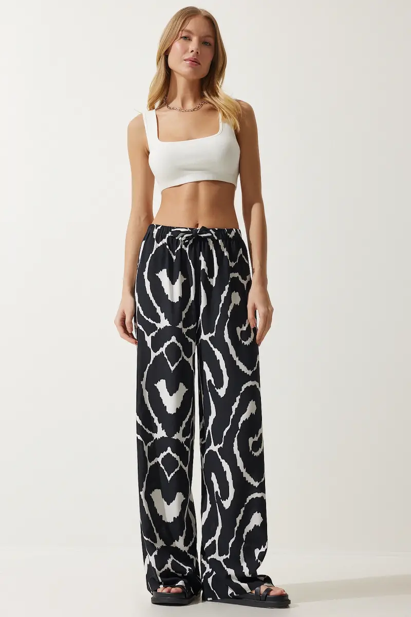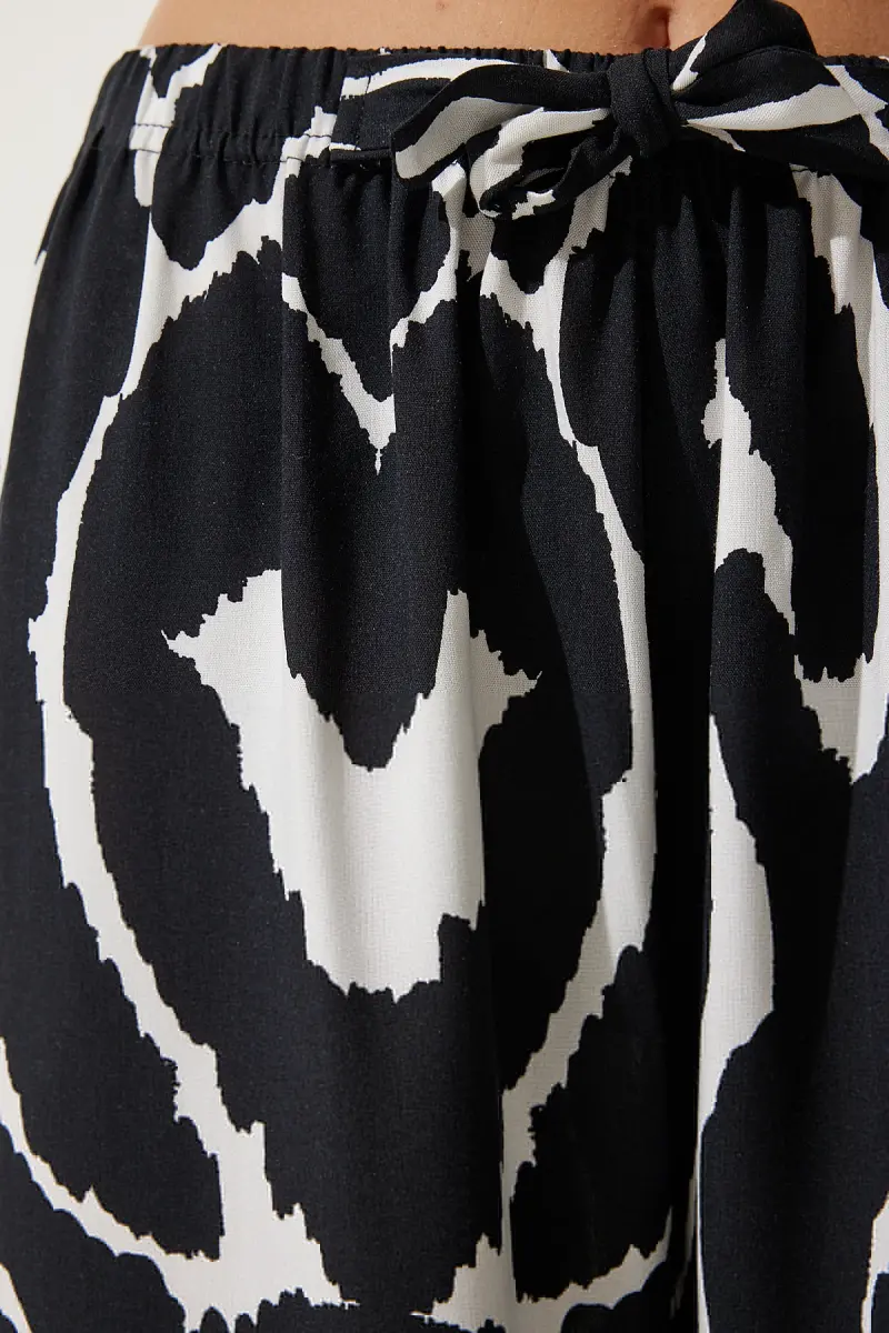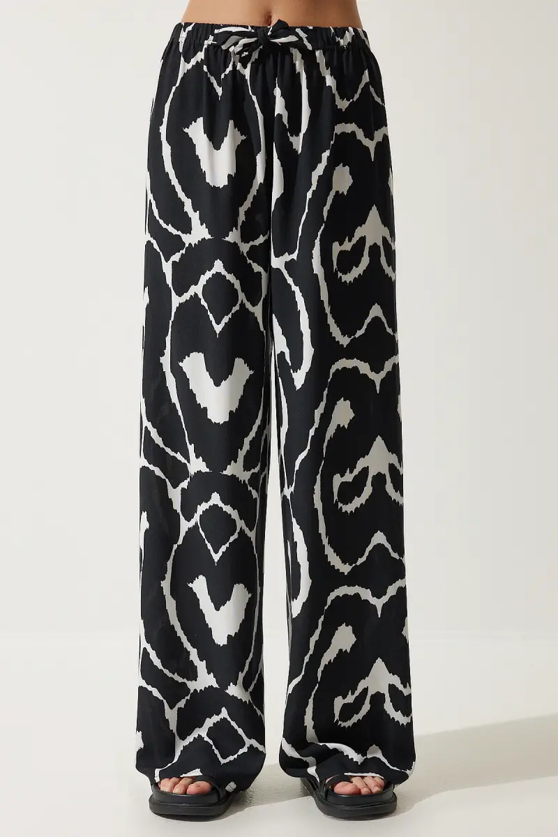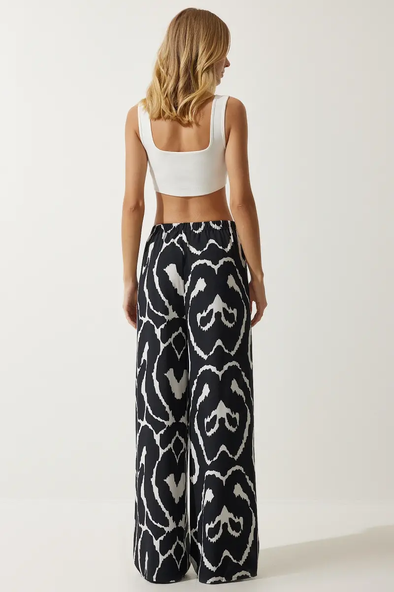 Kadın Canlı Siyah Beyaz Desenli Dökümlü Viskon Palazzo Pantolon EN00606-Canlı Siyah Beyaz