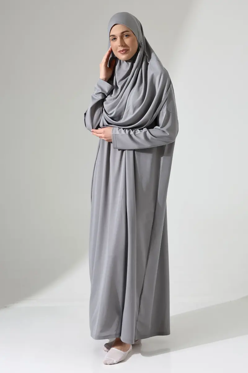 Kadın Çantalı Pratik Tek Parça Namaz Elbisesi - Gri-Gri
