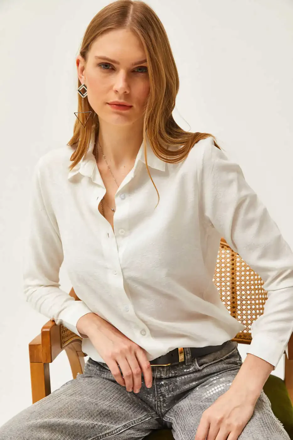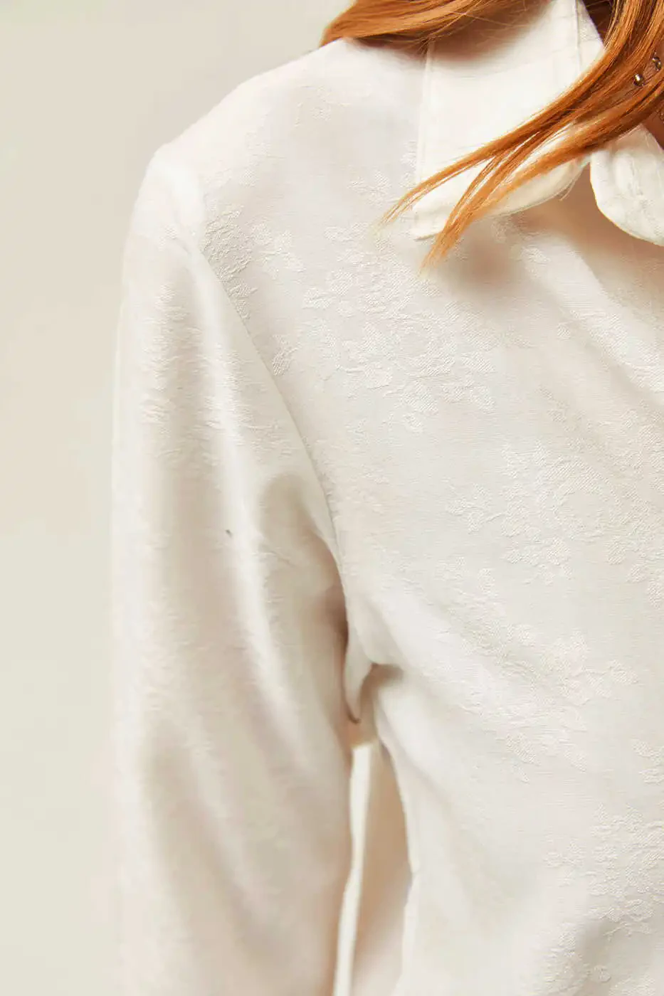 Kadın Çiçek Ekru Jakarlı Saten Detaylı Dokuma Gömlek GML-19001173 ile şıklığı ve zarafeti deneyimleyin!